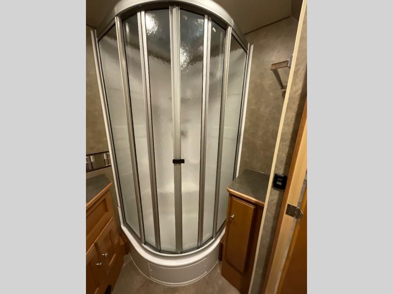 A convenient bath is located in the center of the coach and features a shower with kidney shaped tub, corner sink, toilet, and storage cabinet.