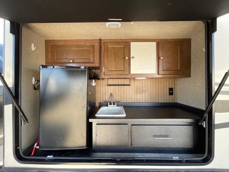 The kitchen area includes an angled double sink and countertop, a three burner range, refrigerator, and a pantry. On the opposite side of the trailer, there is a slide out 46" x 74" dinette and 68" sofa sleeper with overhead cabinets for storage.
