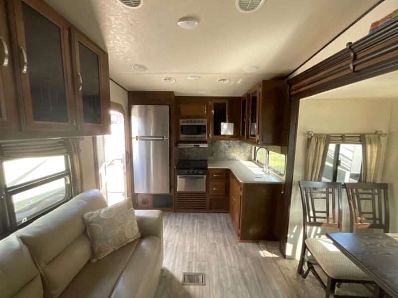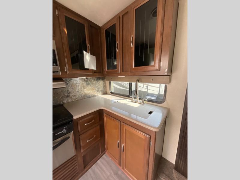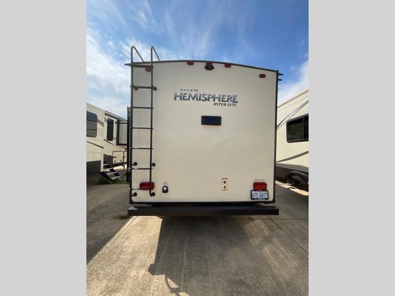 If you have been searching for a fifth wheel with a rear kitchen layout, single slide out, and a front private bedroom then step inside this Forest River Salem Hemisphere Hyper-Lyte 25RKHL.