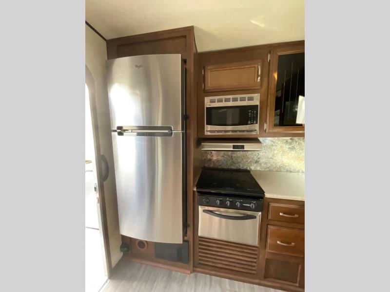 As you enter to your right you will see the rear kitchen layout. There is a refrigerator, three burner range with microwave above, and counter space with overhead storage that continues along the road side wall. There is a large kitchen sink as well.