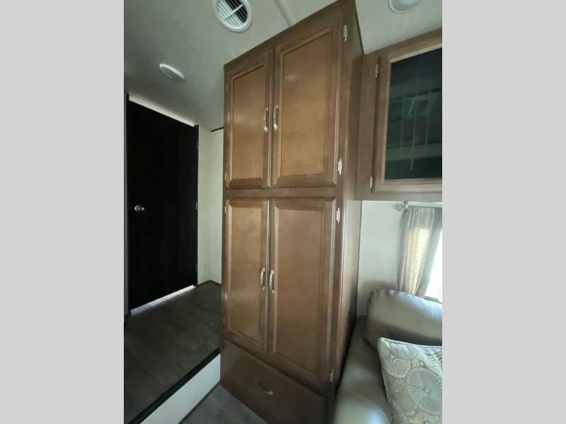 The private front bedroom provides a comfortable queen bed, dual nightstands and overhead storage for more camp clothing, blankets, and such.