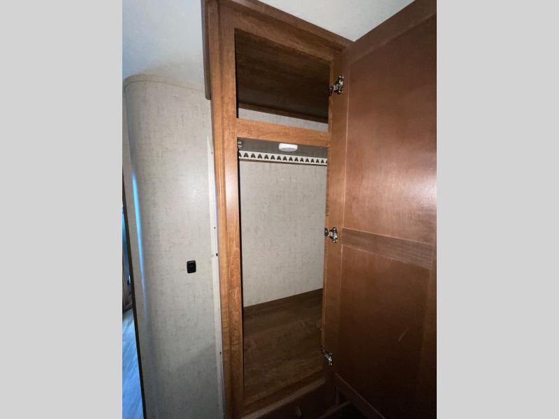 The front master bedroom features a large wardrobe for clothing storage, a queen size bed with overhead cabinets, and two shirt closets above nightstands, one on each side.