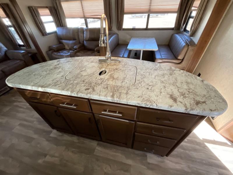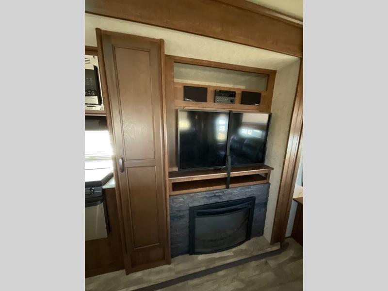 Along the curb side wall you will find a large slide out kitchen and entertainment center that starts with a refrigerator, a three burner range with overhead microwave, and a pantry. Overhead cabinets, lower cupboards and drawers provide ample storage for dishes and food items. The kitchen island off center features more counter prep space, plus it is the location of the double sink for easy clean up. At the end of this slide you will find an entertainment center with fireplace which can easily be viewed from any seating in the room.