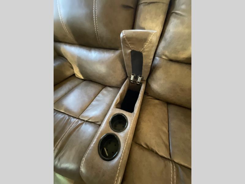 Along the rear wall there is a tri-fold sofa with a queen bed including storage above to help keep things tidy and neat. The slide opposite features more seating with a theatre seat for two including cup holders, and a booth dinette. Both of which provide cabinets above for more storage needs. You can choose a U-lounge with fold-out queen bed and two tables option instead for seating and dining space if you wish.