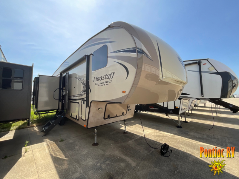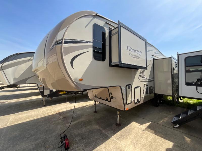 Beautiful and spacious interiors are what you will find throughout each Flagstaff Classic Super Lite fifth wheel. Each floor plan is open and inviting. You will find Driftwood interiors with a decorative cove trim along the ceiling and overhead cabinets. With the WiFi Ranger Wifi Booster you can easily stay connected with your electronic devices. There is also a digital AM/FM/DVD with "Bluetooth" technology. Along the exterior there is a radius roof with vaulted interior ceilings, a one piece seamless roofing membrane, a power awning with adjustable rain dump and LED lighting, plus so much more! The Standard Package is also available on each model which features an upgraded 22" gas oven, solid surface Corian kitchen countertops, a residential Serta mattress upgrade, and thermostatically controlled heated holding tanks, plus so much more!