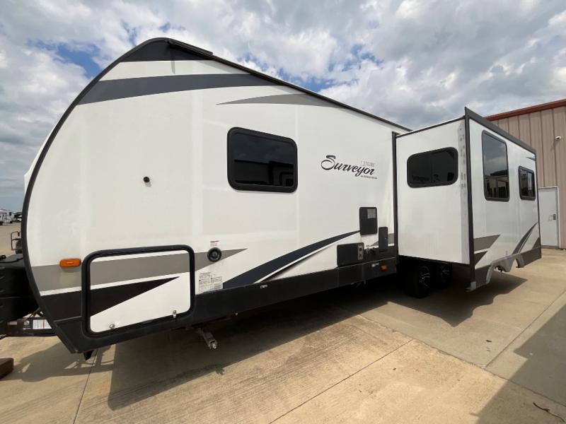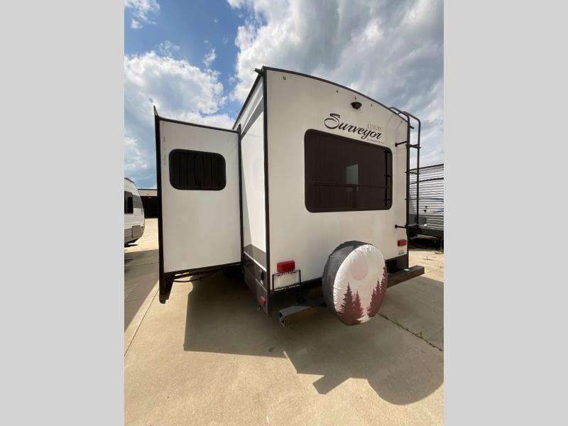 For any camping trip you will want a Forest River Surveyor travel trailer. These models are lightweight and easy to tow, plus you will find that inside there is superior craftsmanship throughout. Along the interior there is a barreled ceiling which adds more headroom in each model and stainless steel appliances for an added at home feature. The designer Carefree flooring is stylish and easy to clean, plus there is a Furrion Bluetooth stereo for you to crank up the tunes. Along the exterior you will enjoy convenient features like the outside shower, the electric awning with LED lights, and the pet friendly utility hook with food bowls too. It is now easier than ever to choose a travel trailer that is ideal for you! What are you waiting for? Come select your Surveyor travel trailer today!