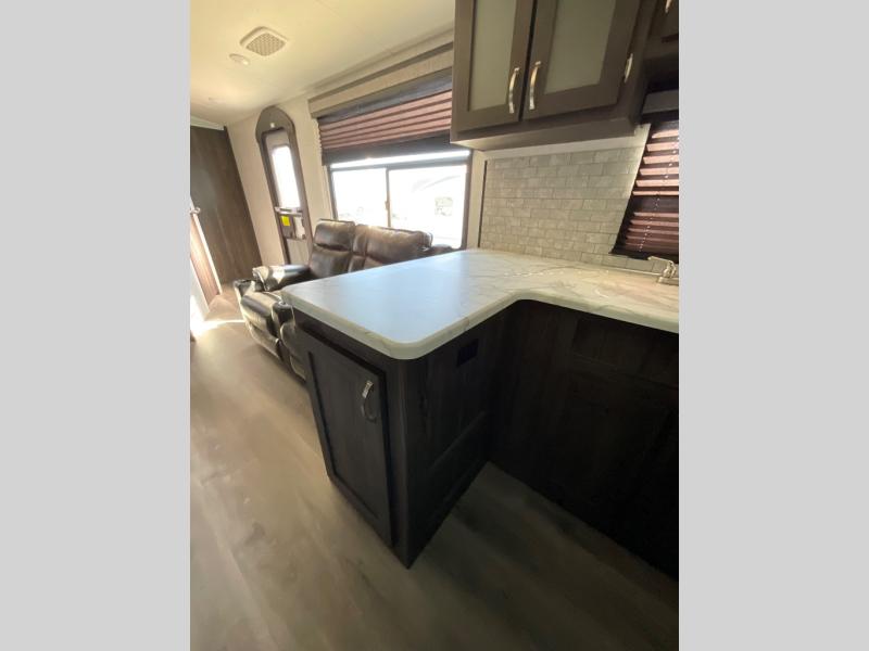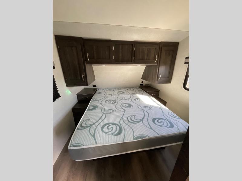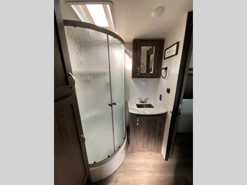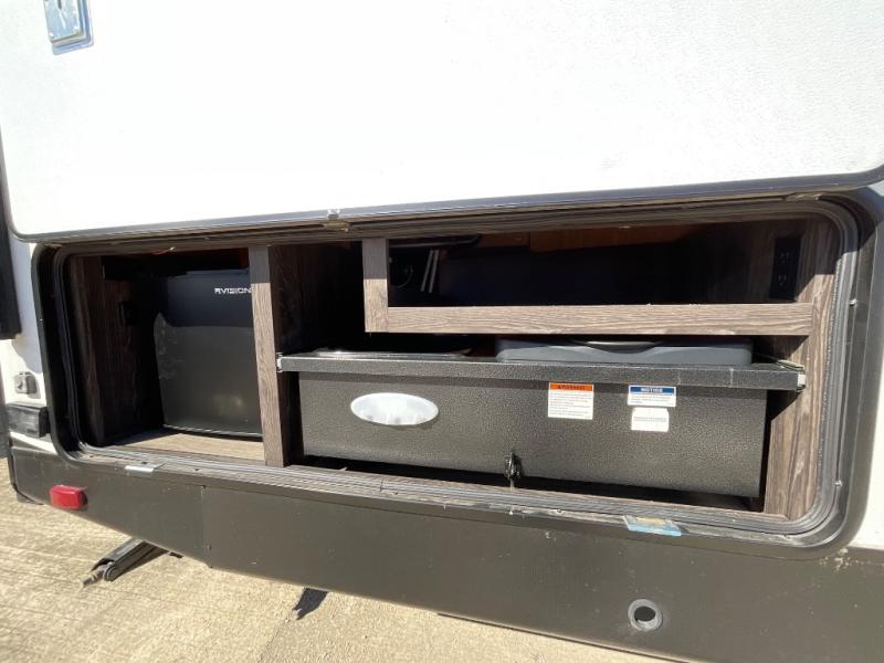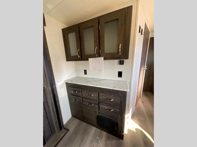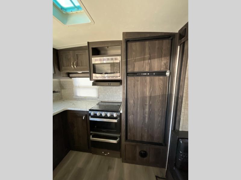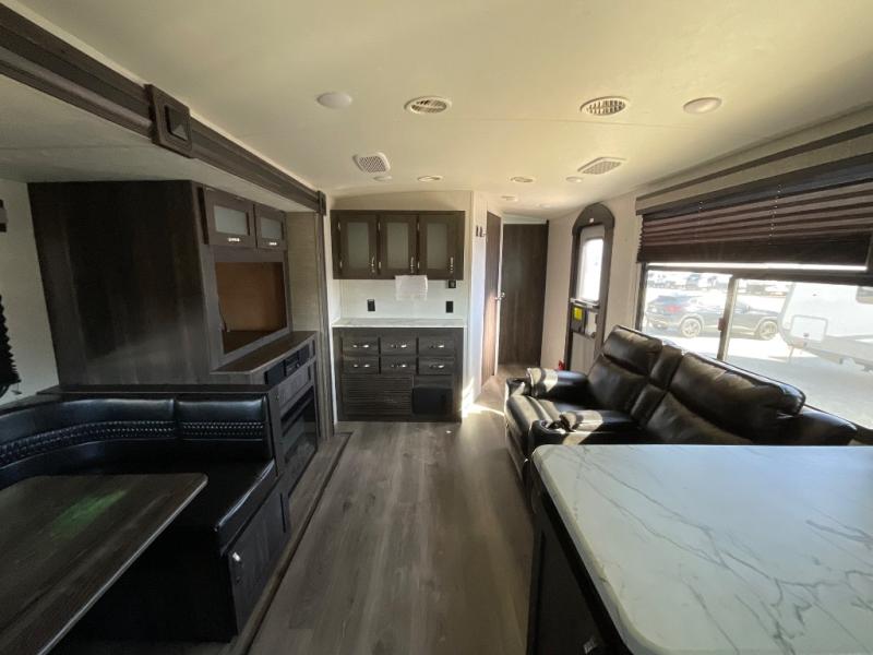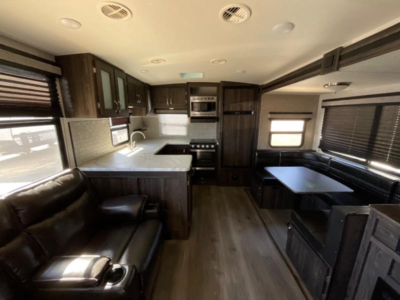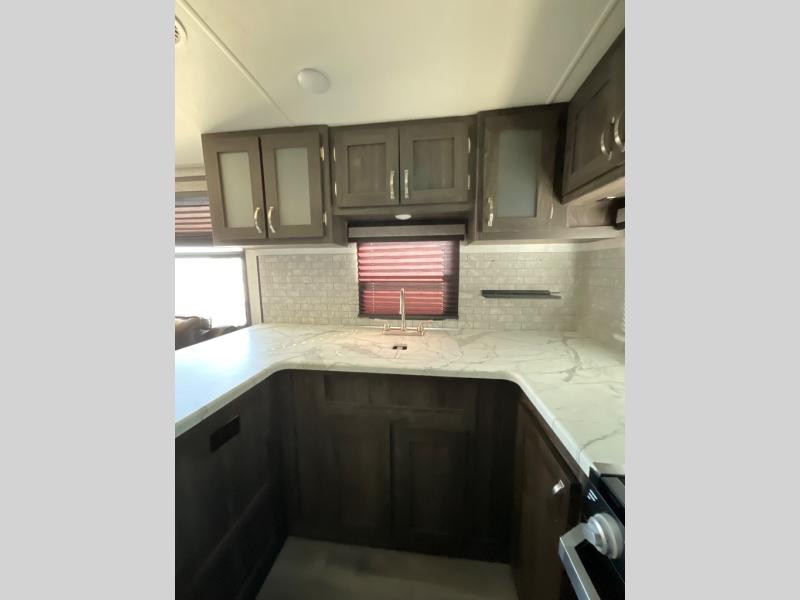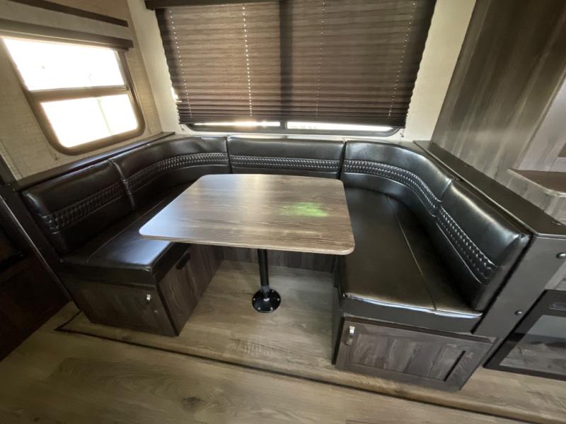 Been searching for a travel trailer that will get your whole family excited? Do you own a late-model half-ton truck? This trailer might just be the solution to your search. You and your spouse can enjoy the master bedroom with the second entry into the bathroom while the kids sleep on the U-shaped dinette while watching the TV and laughing about their fun outdoor day. You might even choose to cook the bacon outside on the outdoor kitchen, and make the coffee inside on the U-shaped counter with plenty of amenities to make more meals. You will find storage throughout the interior for everyone's belongings as well as in the exterior compartments. Mark the check list complete, you found the one!