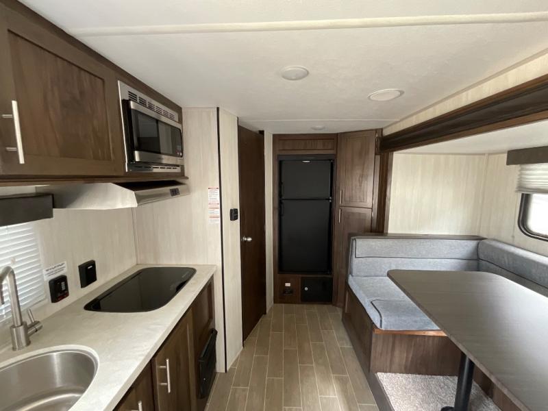 Leave nothing behind when you have plenty of storage inside as well as in the outside storage! You will also find lots of walking around space with the slide out U-shaped dinette fully extended to move from the Murphy bed/sofa to the rear corner toilet and tub/shower room. You will surely enjoy your privacy to change clothes or get cleaned up before starting your outdoor day. Be sure to grab a snack from the refrigerator or the pantry before beginning your hike. And when you return, grab your camp chairs from the outside storage to relax under the power awning providing you an outdoor living space.