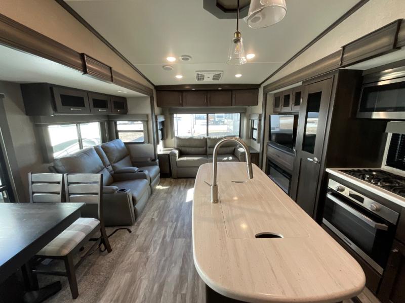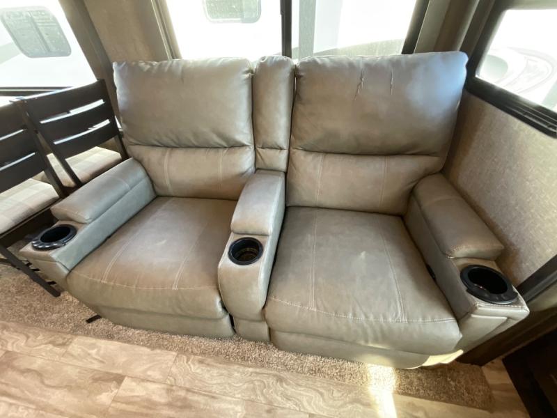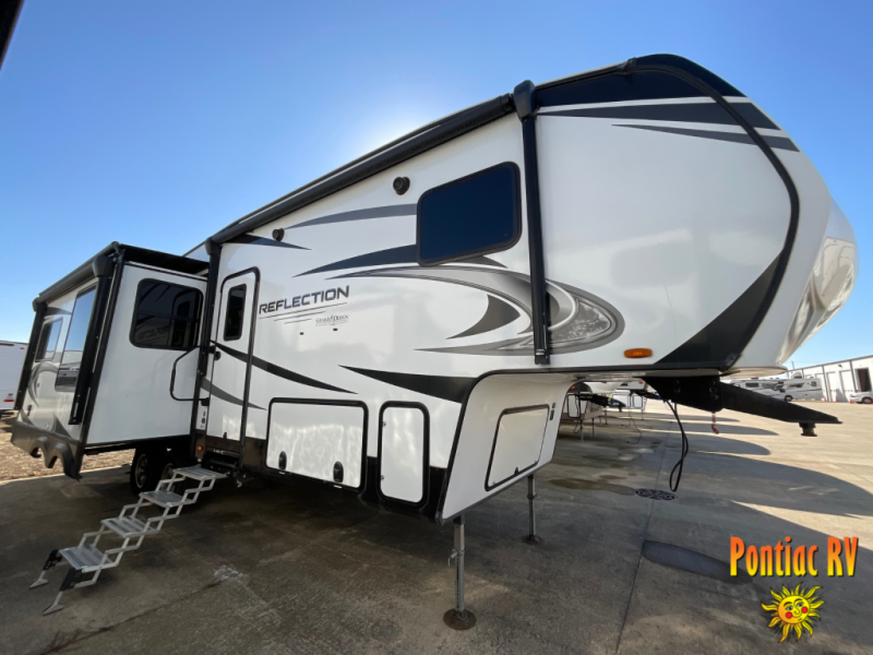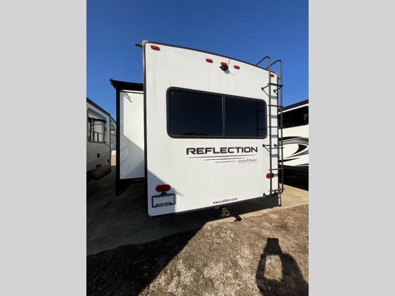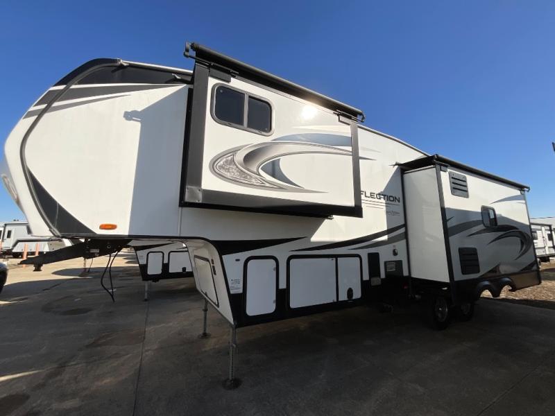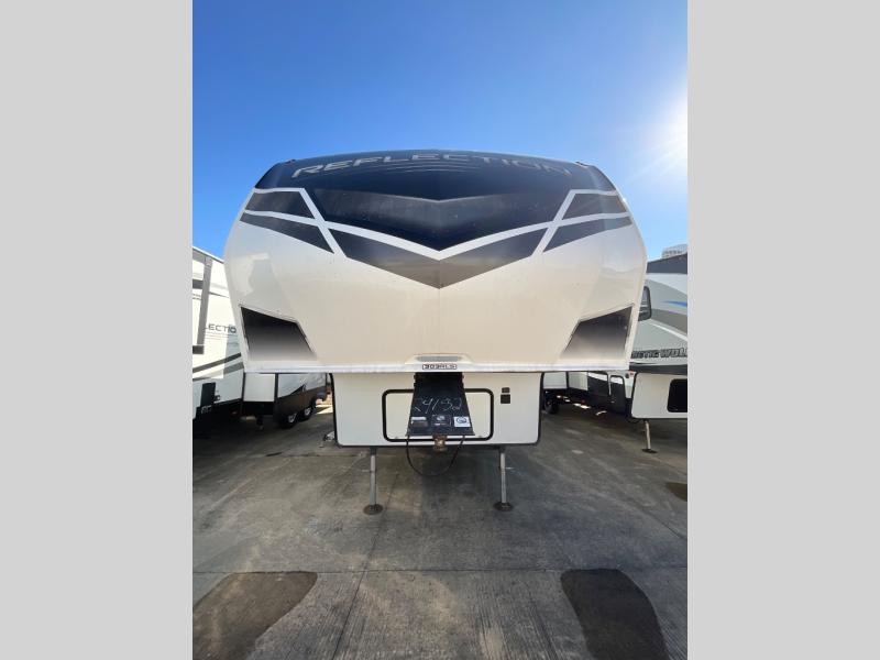 You will enjoy the comforts of home while on the road with this Reflection fifth wheel! It features a front private bedroom with a queen bed for you to enjoy a good night's rest, under the bed storage, and closets/drawers for you to keep all of your clothes neat and tidy. After an adventurous day, you can head to the rear living area where you will have your choice to relax on either the tri-fold sofa or the theater seats while you watch your favorite movie on the 40" TV or enjoy a cozy fire in the fireplace. The kitchen has everything you will need to whip up your best meals including a kitchen island with a large sink to make your clean up a breeze. Don't forget about storing your camp chairs and golf clubs in the exterior unobstructed pass-through compartment too. This model has many more standard features to enjoy and options to choose from, come see today!