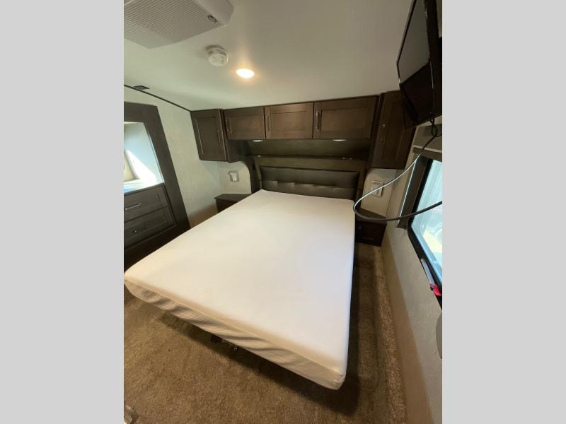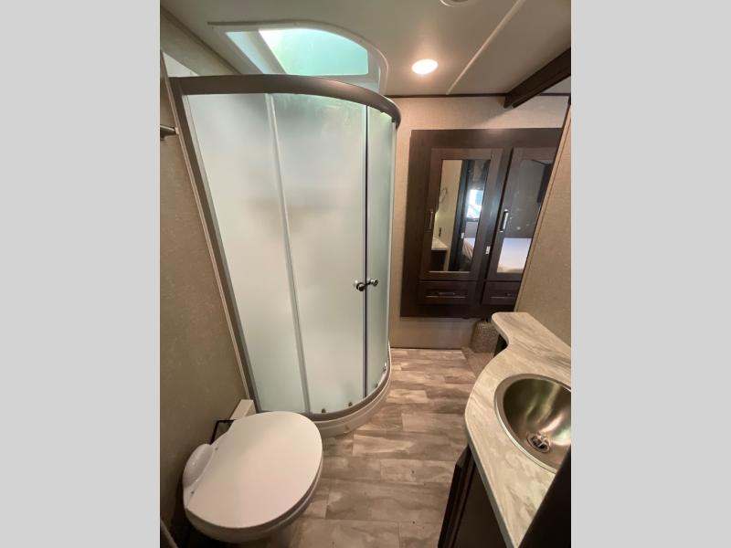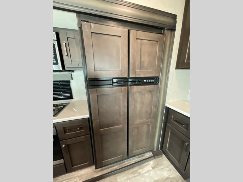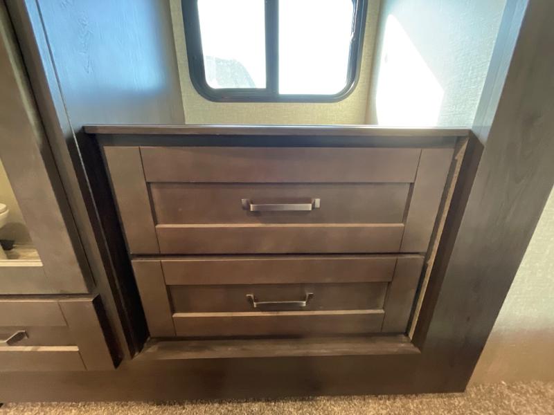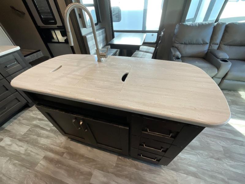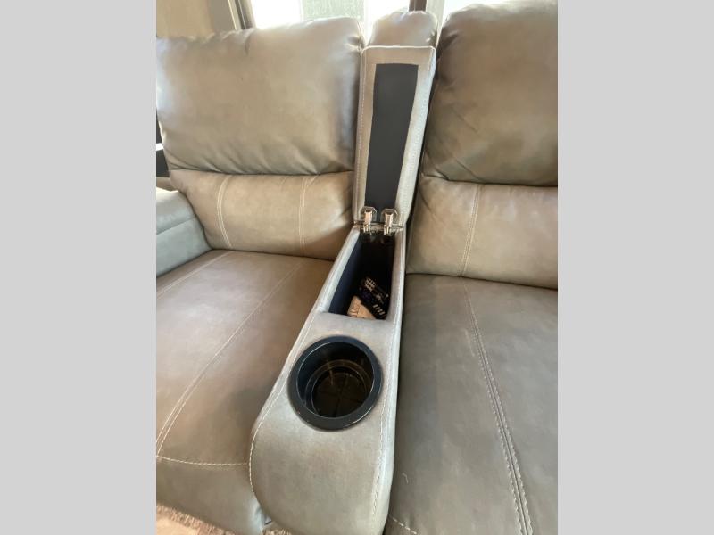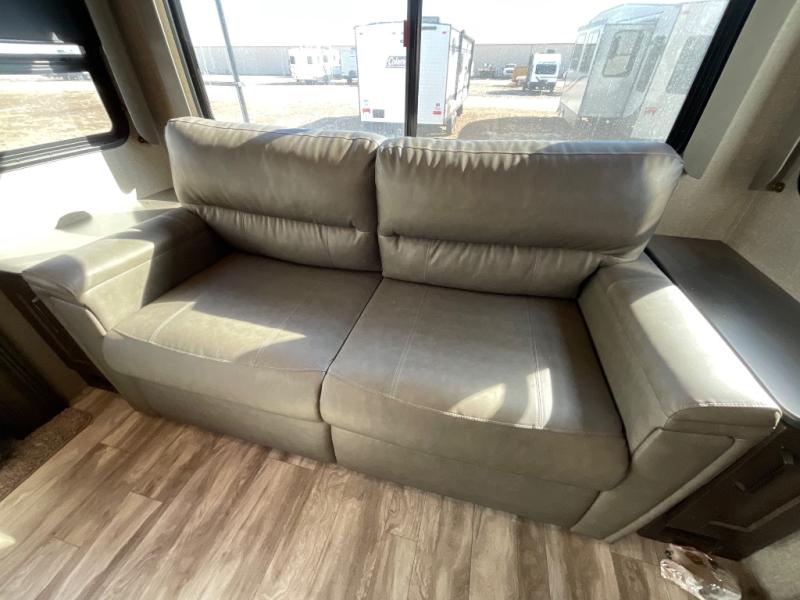 You will enjoy the comforts of home while on the road with this Reflection fifth wheel! It features a front private bedroom with a queen bed for you to enjoy a good night's rest, under the bed storage, and closets/drawers for you to keep all of your clothes neat and tidy. After an adventurous day, you can head to the rear living area where you will have your choice to relax on either the tri-fold sofa or the theater seats while you watch your favorite movie on the 40" TV or enjoy a cozy fire in the fireplace. The kitchen has everything you will need to whip up your best meals including a kitchen island with a large sink to make your clean up a breeze. Don't forget about storing your camp chairs and golf clubs in the exterior unobstructed pass-through compartment too. This model has many more standard features to enjoy and options to choose from, come see today!
