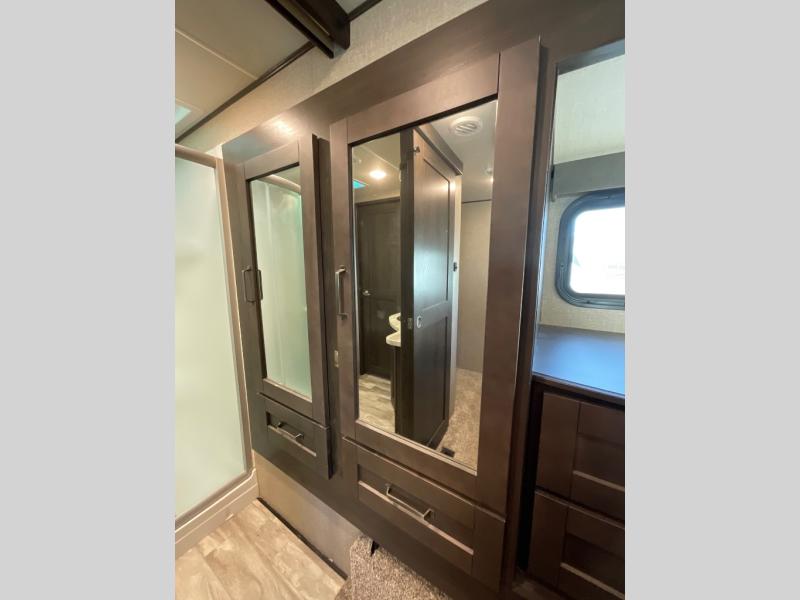 Each Reflection fifth wheel by Grand Design offers luxury along with easy towing to your favorite destinations with the aerodynamic front cap including Max Turn Radius. The Universal All-In-One docking station, LP Quick Connect, and One-Touch electric awning with LED lighting makes setting up and packing up easy for those weekenders or full-timers that like to move around. Inside, you will find the bedroom is complete with a residential queen mattress, a king size wardrobe, oversized underbed storage, and much more! The Arctic 4-Seasons Protection package allows you to camp anywhere and anytime of the year with its heated and enclosed underbelly, EZ winterization, dual attic vents, plus so much more. Come choose your favorite model today!