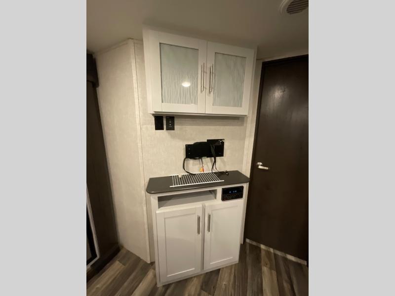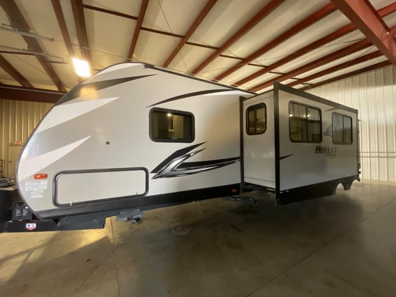 Come see just how fun and easy camping can be with this double-slide Bullet travel trailer by Keystone. When you are playing outside, you will enjoy the convenience of the outdoor kitchen as you grab your favorite cold beverage from the mini refrigerator, and the 19' electric awning with LED lights will give you extra shade when you need to cool off from the sun's hot rays. The inside of this trailer is a hostess' dream with a private bunkhouse that contains one of the two entry doors, as well as its very own half bathroom. Not only will your guests be living in the lap of luxury, but so will you with your very own private master suite.