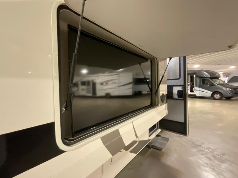 You will feel right at home in this motorhome perfect for your family vacations. Once you arrive at your destination, swivel the captain's seats around to enjoy coffee at the driver/passenger pedestal table. The 50" LED TV is across from the theater seating for your viewing comfort, and the 39" LED TV is in perfect view from the drop-down queen bed. The chef of the family will have everything they need to prepare meals each day, including a three burner drop-in range/oven, an over-the-range microwave, plus a large pantry to store dry goods. You and your spouse can retreat each night to the rear private bedroom that includes a Serenity Series king bed, plus plenty of storage space for clothes and shoes!