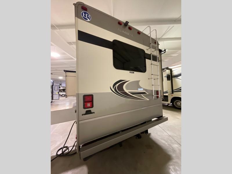 The Admiral Class A gas motorhome by Holiday Rambler is packed with family-friendly features and open living spaces so you can make the most of your vacations. Each model features a 7.3L Triton V8, 350 HP engine with an 8,000 lb. hitch capacity to bring along the family car. These motorhomes are constructed with quality materials, such as Vacu-Bond walls and ceilings with a Powerlock System, aluminum welded interlocking frames, and a powder coated steel frame chassis. You will enjoy each driving experience with the electronic instrument panel, the standard traction control, and larger front and rear sway bars. Inside, you will feel right at home with stainless steel appliances and eye-catching kitchen backsplash, a residential faucet and glass shower door in the bath, plus solid wood, raised panel cabinet doors. The exterior includes many convenient features, such as an electric awning with LED lights, an exterior entertainment center with a 50" TV, and a basement pass-through storage for items big and small!