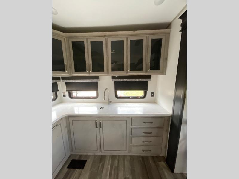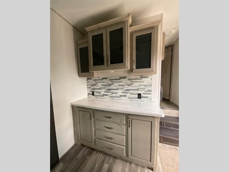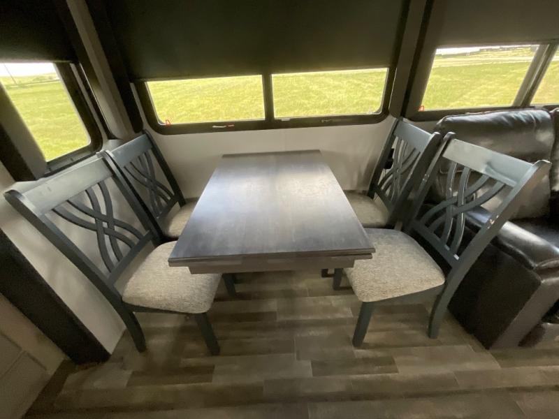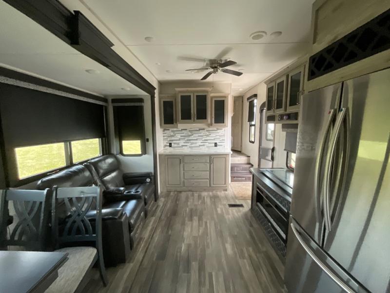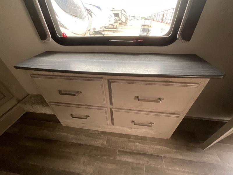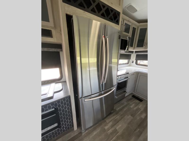 Looking for a spacious rear kitchen with everything you need to make meals, dine at the legless dinette table with storage and four high-back dinette chairs with storage, and enjoy a cozy evening inside with the designer fireplace? Look no further! This perfect couples fifth wheel offers just that plus a hutch for more storage and a place to display your family photos, a pop-up 50" LED TV to watch, and a double entry bathroom for convenience. You will find storage under the king bed slide out, and within the master closet, the chest, and there is a place for a stackable washer/dyer if you decide to add that option. You might like to choose the residential refrigerator option as well.