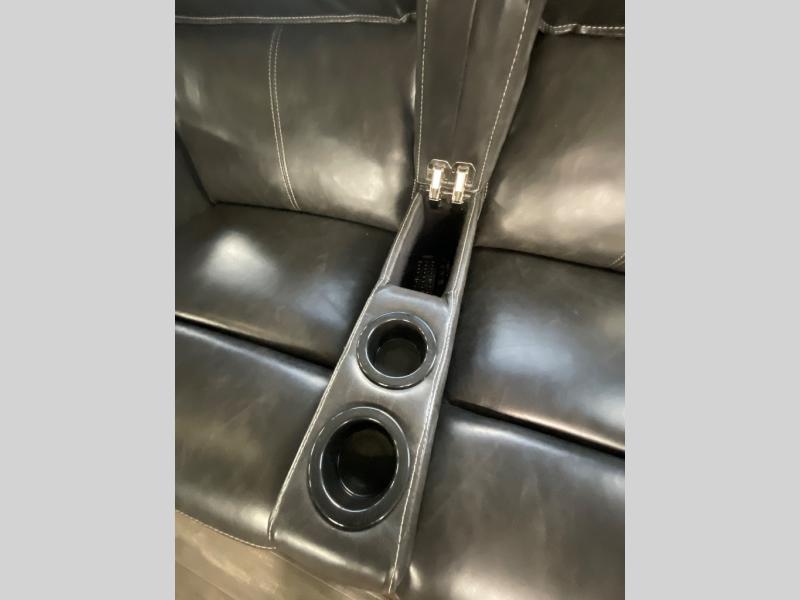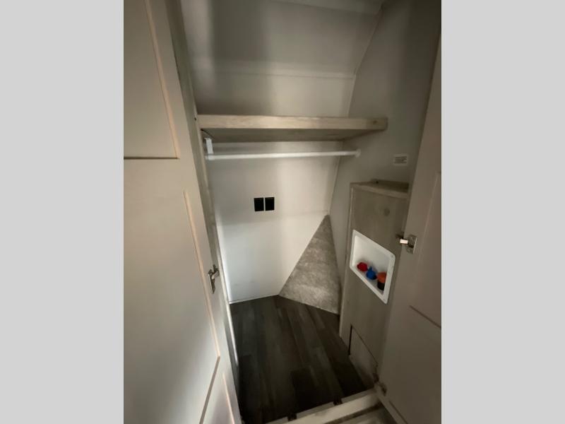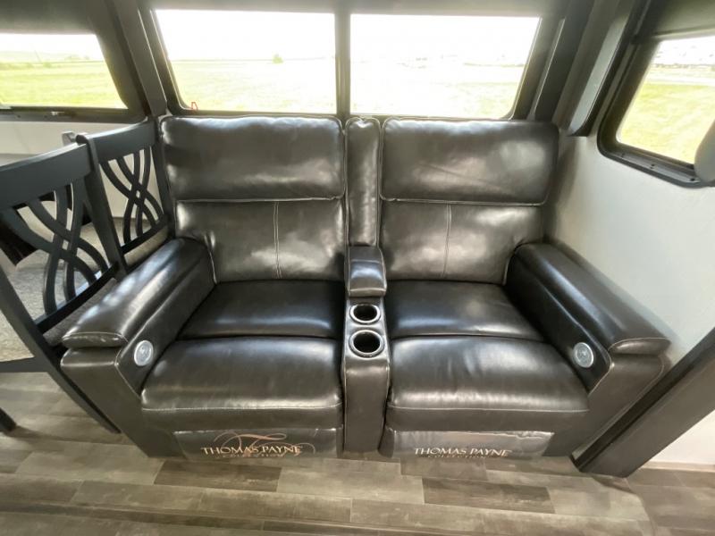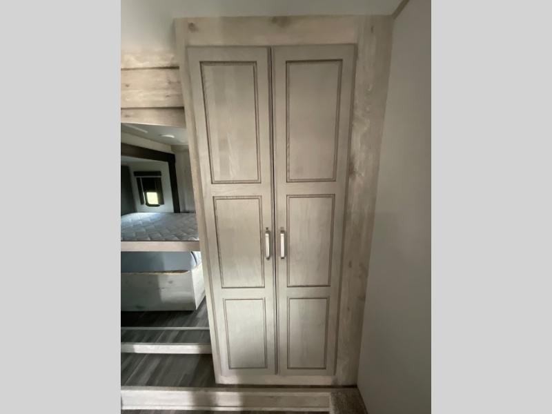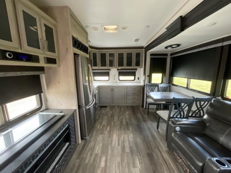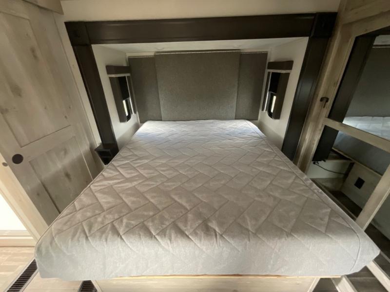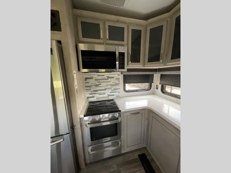 Looking for a spacious rear kitchen with everything you need to make meals, dine at the legless dinette table with storage and four high-back dinette chairs with storage, and enjoy a cozy evening inside with the designer fireplace? Look no further! This perfect couples fifth wheel offers just that plus a hutch for more storage and a place to display your family photos, a pop-up 50" LED TV to watch, and a double entry bathroom for convenience. You will find storage under the king bed slide out, and within the master closet, the chest, and there is a place for a stackable washer/dyer if you decide to add that option. You might like to choose the residential refrigerator option as well.