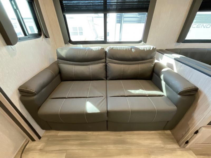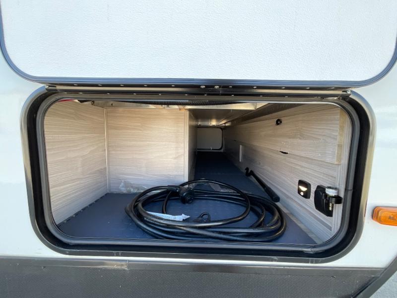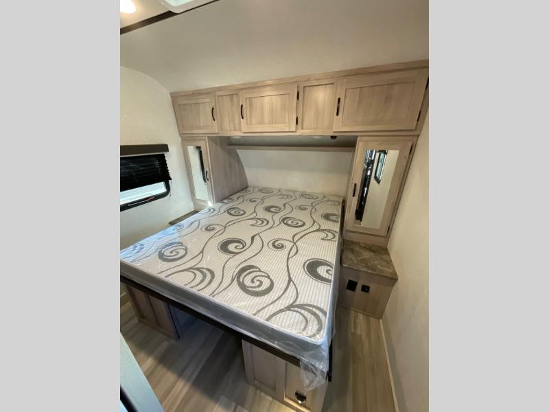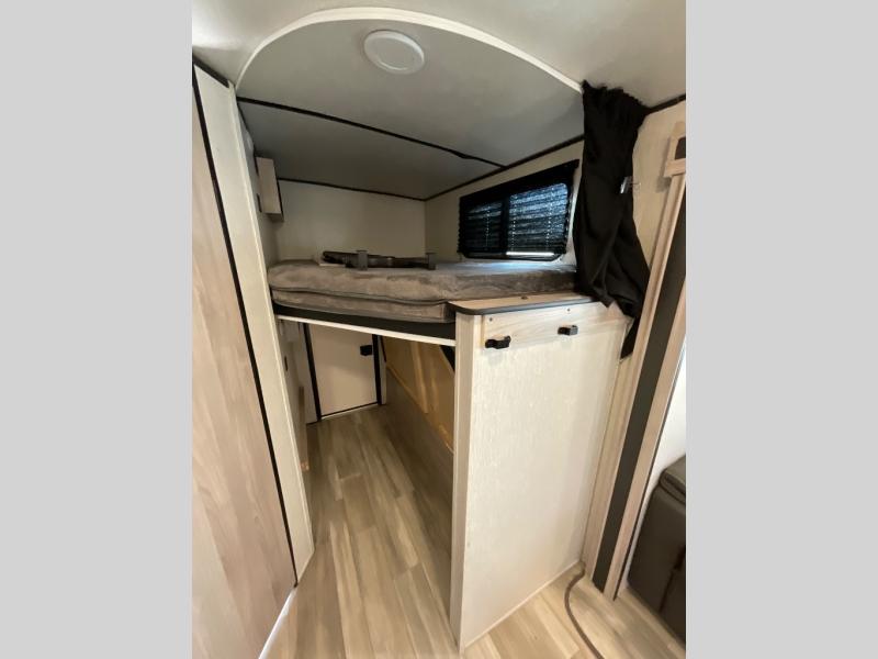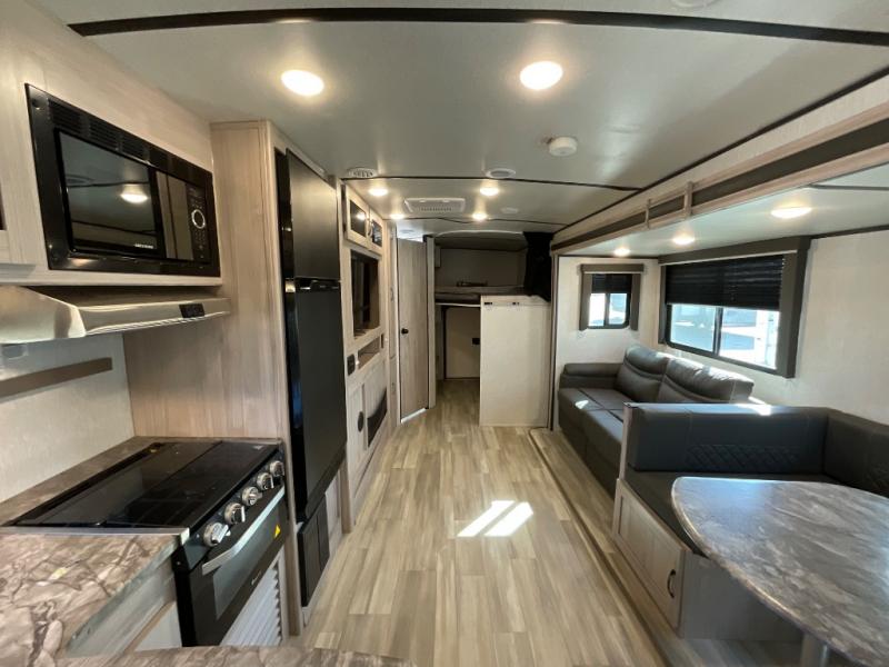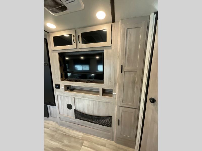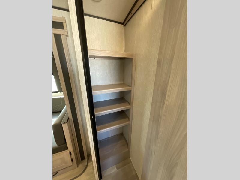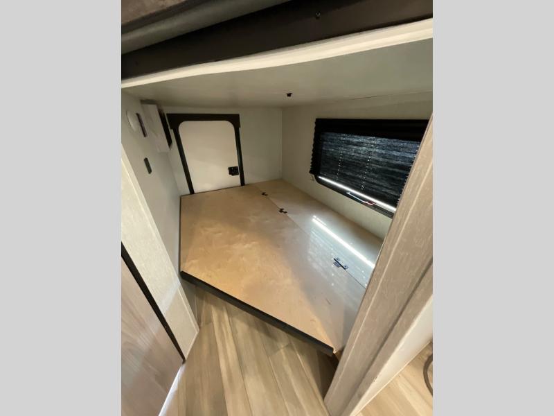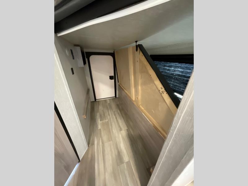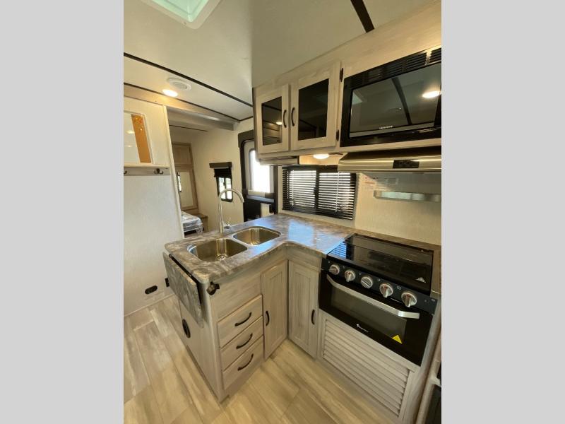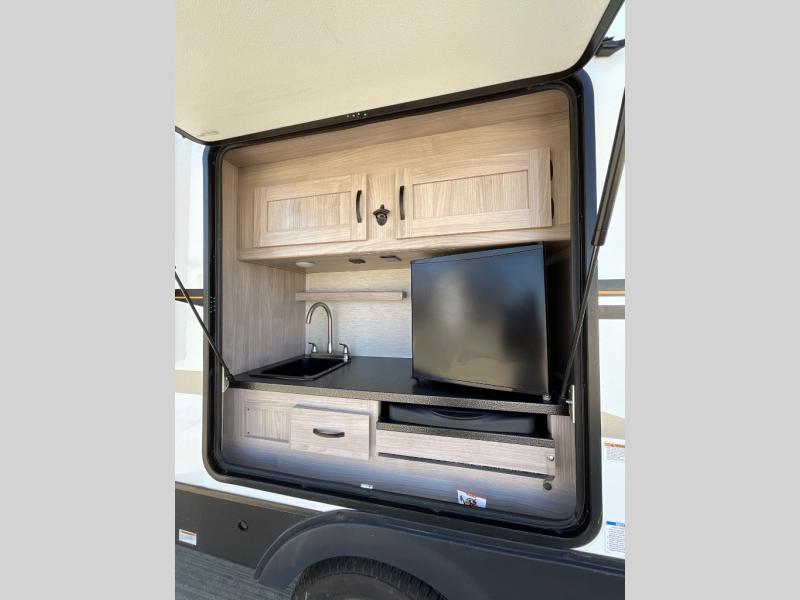 This is a popular bunk trailer for a larger family thanks to having the convenience of dual entry doors allowing access to the main living and kitchen area and near the front bedroom, and into the full bathroom for a quick in and out when playing outside. The bathroom also includes a hamper. The Stor-More cargo door allows you to place items from the exterior to the interior under the lower flip bunk for safe travels to your destinations and back home. The kids will surely love the convenience centers when playing or sleeping in a bunk. There is a sofa and U-shaped slide including a pet center for relaxing and feeding your pet. The kitchen includes full amenities plus a pantry to store lots of goodies for everyone. Along the exterior, the outside camp kitchen will come in handy when you have everyone at the campsite for dinner and the power awning offers some protection from the elements.