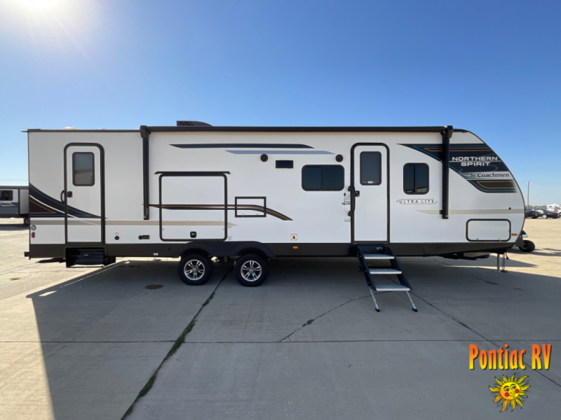 With any Northern Spirit Ultra Lite travel trailer by Coachmen, the "Twice Cool" dual ducted air conditioning system, the motion activated floor lights in the bedroom and bathroom, the lighted USB ports, the digital level, and the motion activated pass-through storage light plus fishing pole storage, will make your camping experience simplified. The heated and enclosed underbelly provides protection on the road and allows you to camp during any season, the 100W solar panel with 10 amp controller provides off-grid camping, and the power tongue jack makes setup easier. Each is built with a painted fiberglass front cap with LED strip lights, a laminated, aluminum framed floor, rear wall, and sidewalls, plus 5" trusses with interior vault. Make your decision today, and camp with everything in its place!