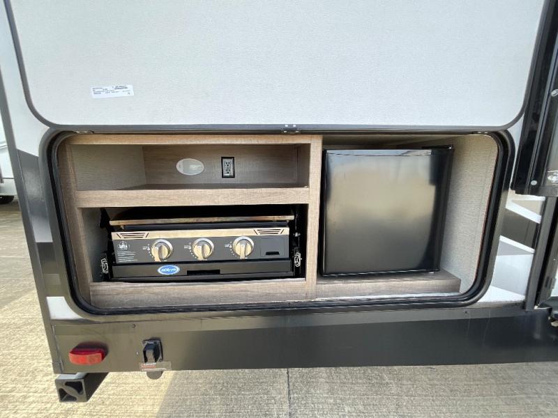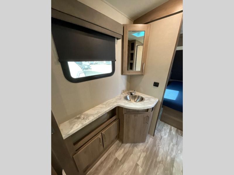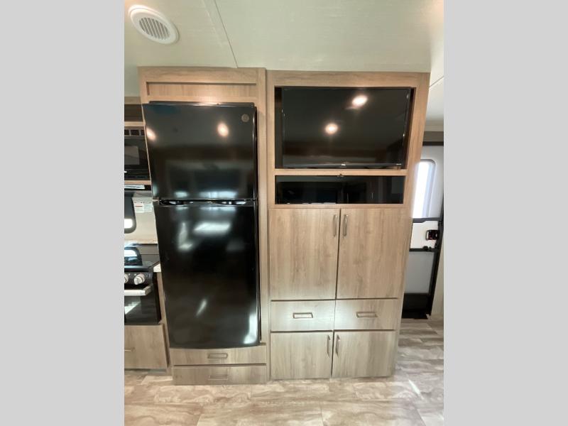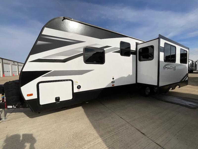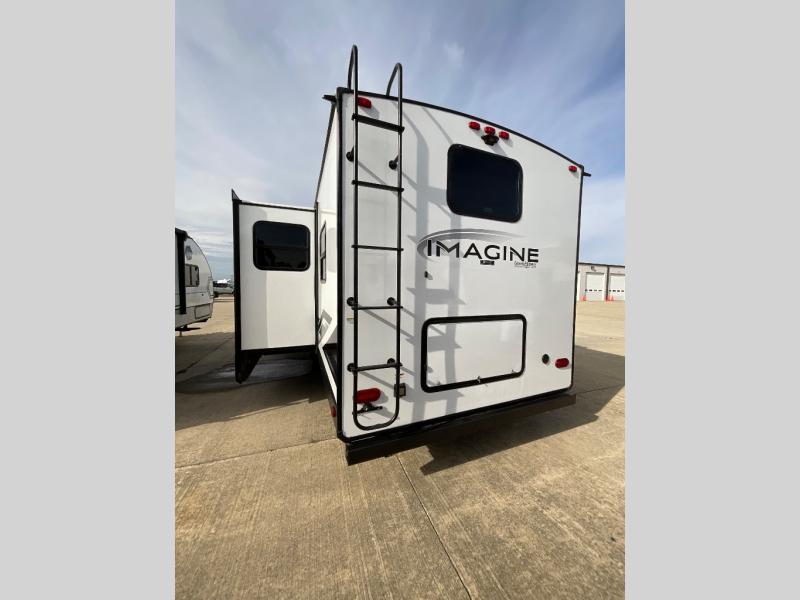 With this Imagine travel trailer, you won't have to imagine what a great camping trip will be like because you can live it! The kitchen includes everything you will need to prepare a meal for everyone, like a 10-cubic foot refrigerator, three-burner range with oven, microwave, stainless steel sink, and flip-up countertop extension. There is a pet dish below the refrigerator, and the LED HDTV sits across from the tri-fold sofa and U-shaped dinette with removable ottoman so that you can watch a movie or the big game in comfort. Another great addition is the private bunkhouse because it provides you with a second secluded sleeping space. This bunkhouse includes a wardrobe, drawers, and an area prepped for a TV.