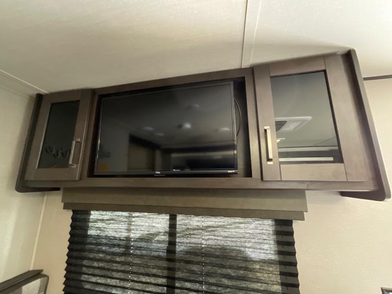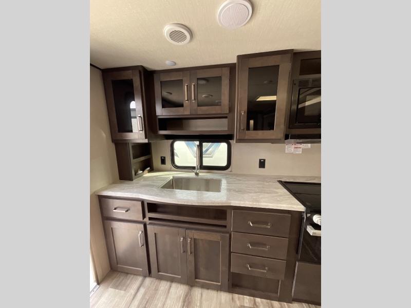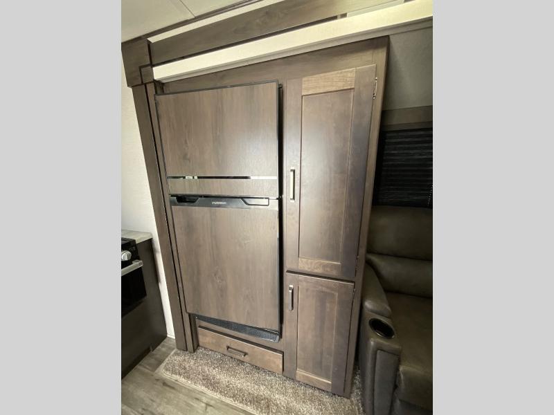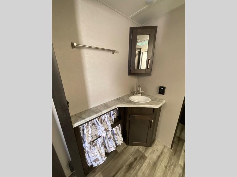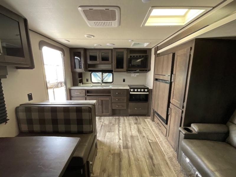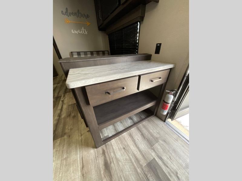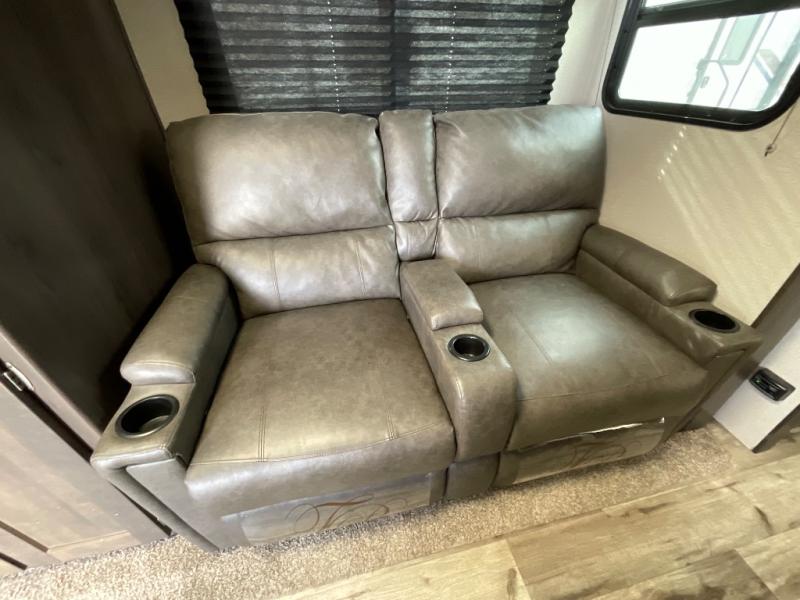 This couple's trailer is perfect for all your outdoor excursions. When you aren't relaxing with a cold drink under the 20' power awning, you may find yourself cooking in the rear kitchen or relaxing on the 62" theater seating. There is a booth dinette perfect for a guest or two little ones to sleep on, plus there is a walk-through bath that is conveniently located for everyone. You'll get a great night's rest on the queen bed in the front master bedroom, plus you have your own exterior entry door so that you can sneak out early to get some fishing done!