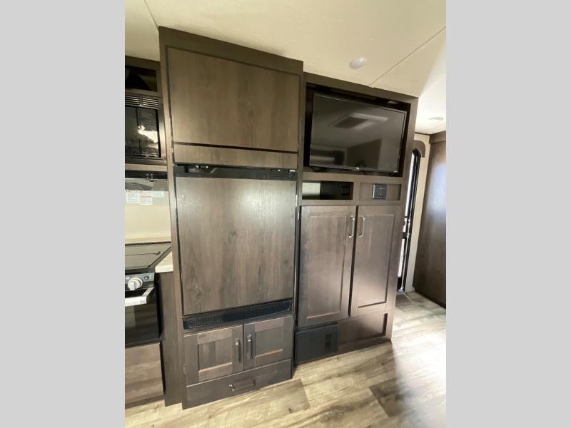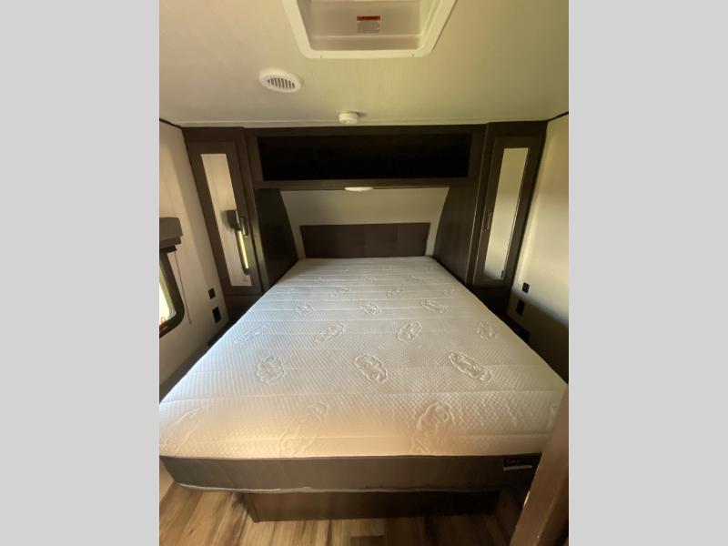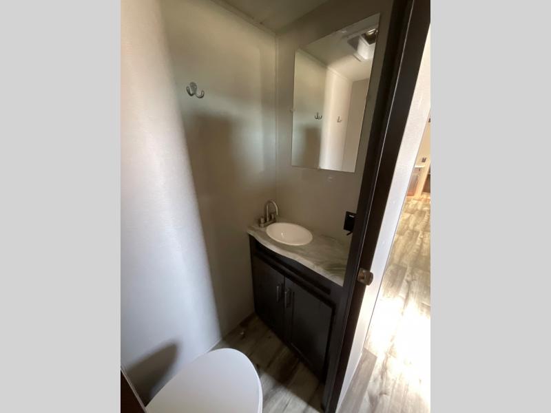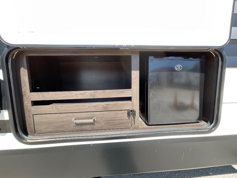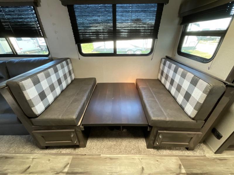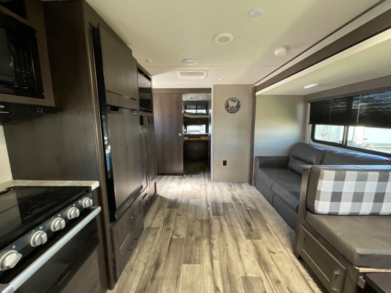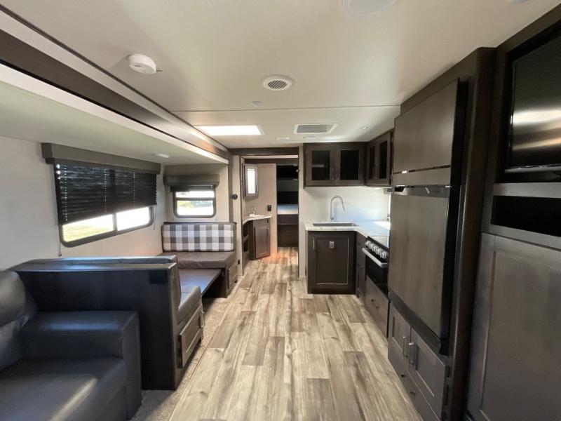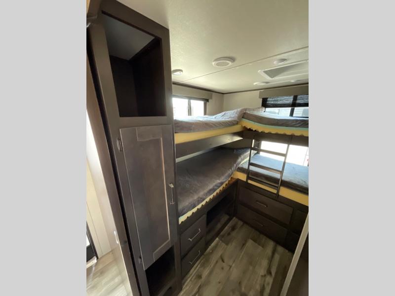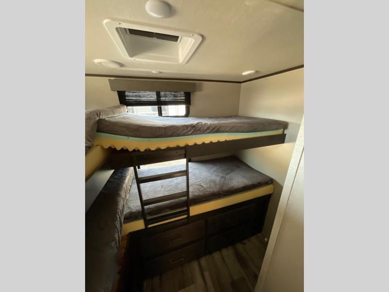 Head to the lake for unforgettable camping trips in this dual-entry travel trailer. The private bunkhouse suite includes four bunks, two drawers to store belongings, plus a half bath for convenience. Everyone will love to gather in the main living area that includes a tri-fold sofa or optional theatre seating, a booth dinette, plus a 32" LED HDTV on a swing arm for a perfect view. You'll find plenty of storage space, including a wardrobe/pantry, a broom closet, plus plenty of overhead compartments for your valuables. This model also includes a full indoor kitchen, as well as an outdoor kitchen with a two-burner cooktop, an exterior spray port, plus a 1.6-cu. ft. refrigerator for cold drinks.