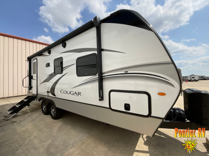 Imagine waking up from your own king bed to enjoy a hike, a bike ride, or a relaxing time outside under the 16' power awning while you wait for your spouse to wake up. With this Cougar Half-Ton travel trailer, you can make breakfast inside with full amenities and eat at the U-shaped dinette while looking out at the views. You will be able to get cleaned up in the full bathroom without having to wait your turn for the public facilities. Plus, there is a privacy curtain for the bedroom so that you have an additional place to get ready, and the bar top gives you extra room to sit down with a hot meal.
