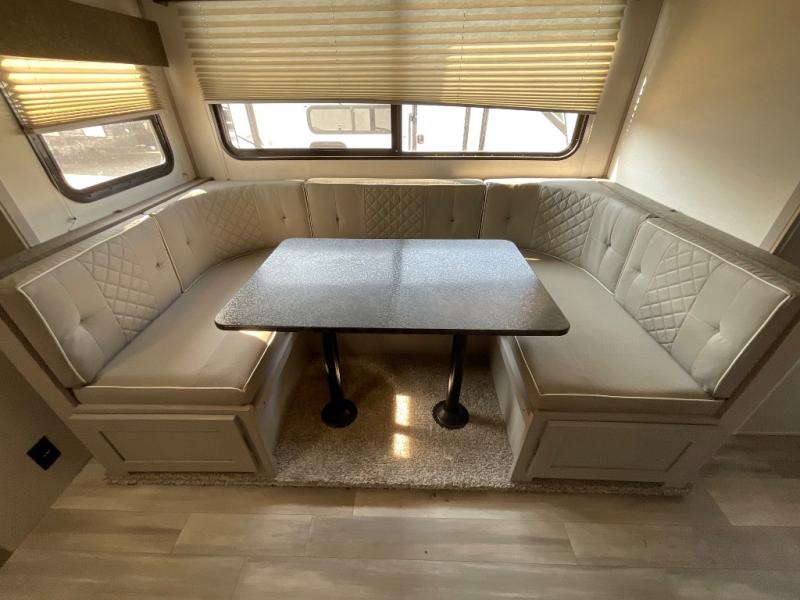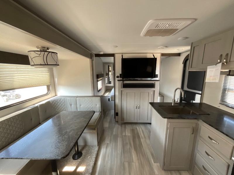 Head to the campsite with this Tracer in tow to enjoy comforts inside after you explore outside! Beginning with the front bedroom which includes a queen bed with a partial wall for separation to the U-shaped dinette slide that offers windows and plenty of seating and dining space, you might complain every time you have to return home. The well-equipped kitchen offers everything you need, and the pantry gives you more storage, and the farm-style sink makes cleaning up easy. You can also make meals using the outside kitchen while others relax under the 19' power awning.