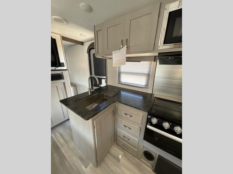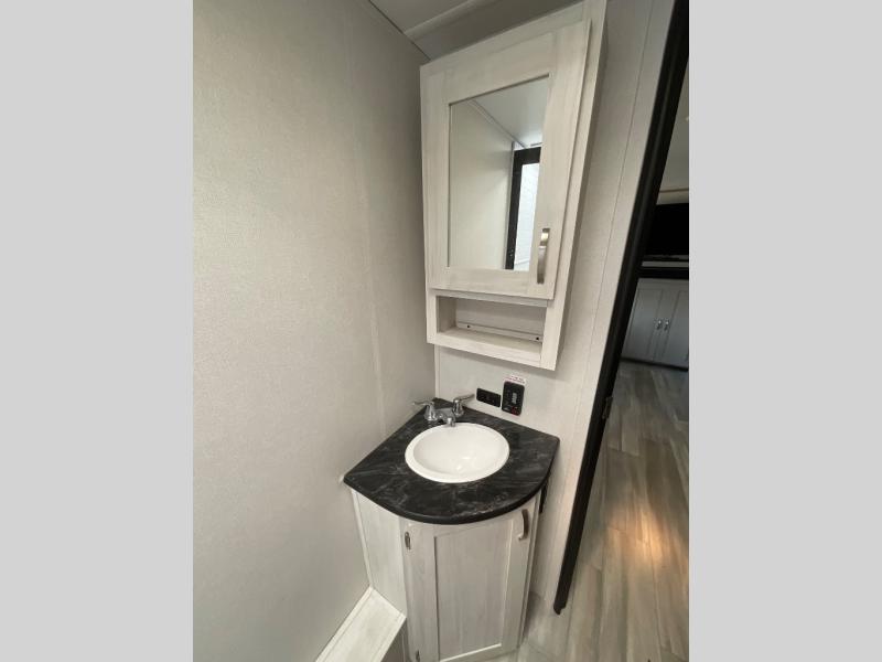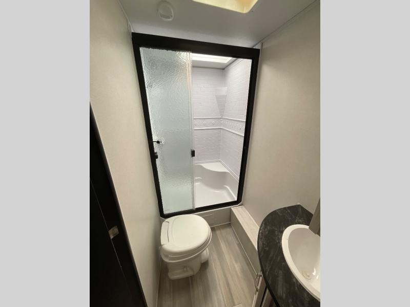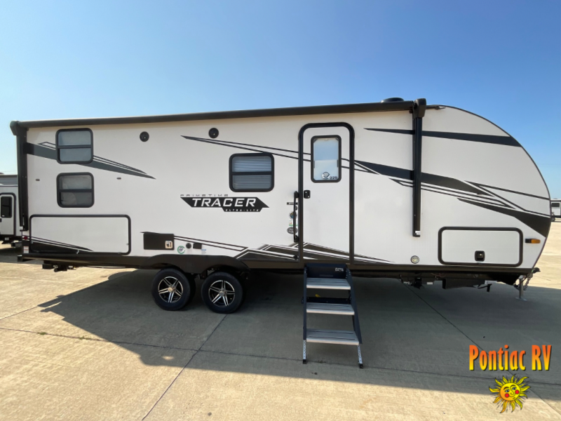 With any Tracer travel trailer by Prime Time, you will have Eternabond construction, a fiberglass front cap, a fully enclosed and heated underbelly by radiant and forced air heat to tank compartment for four seasons of travel, electric stabilizer jacks for easy setup, plus solid stance entry steps and an XL grab handle for a secure entry and exit. Inside there is LED lighting throughout with motion sensor lights in key locations, shaker style cabinet doors, solid surface galley countertops and a stainless steel galley sink, plus more depending on the trailer you choose!