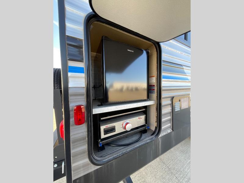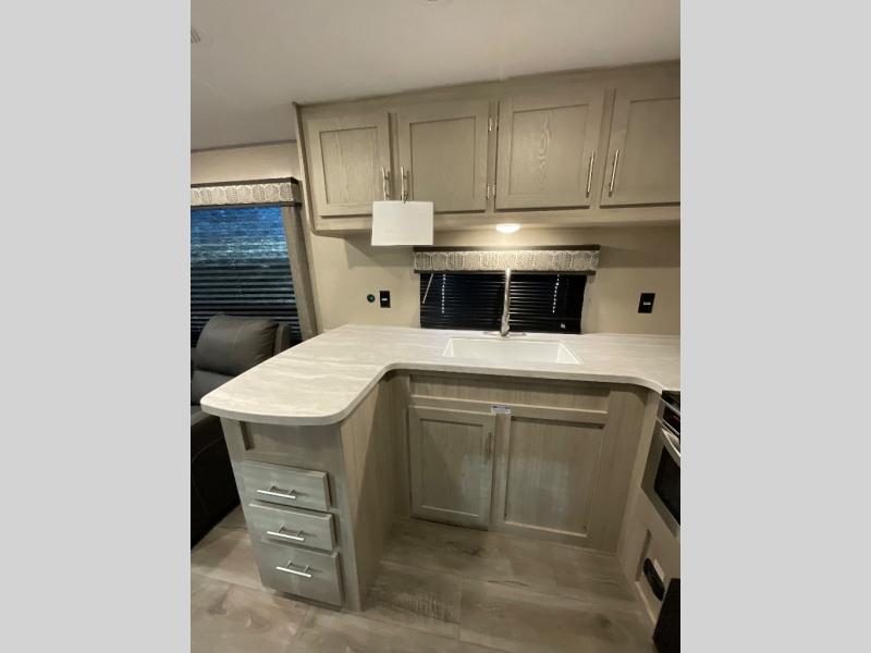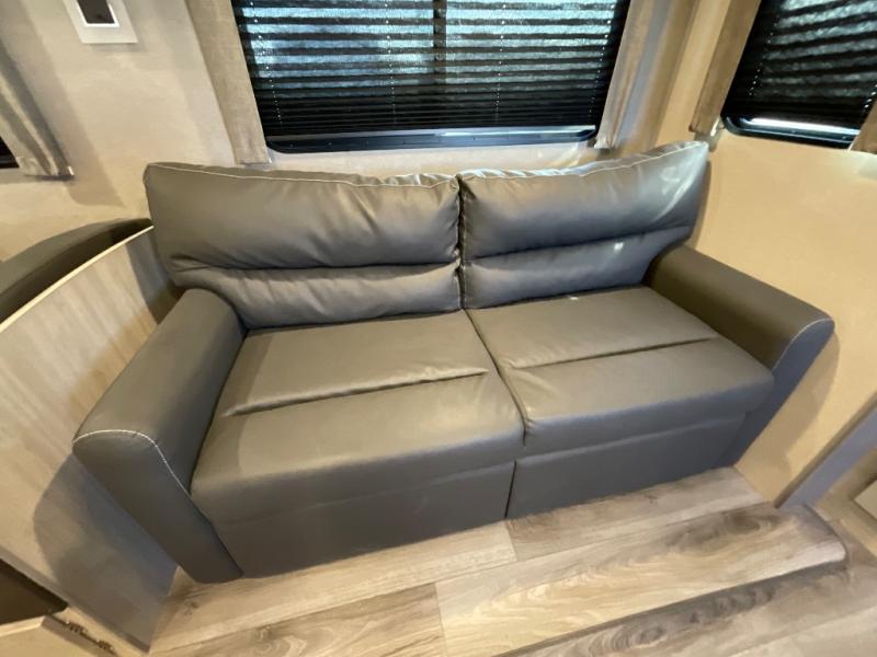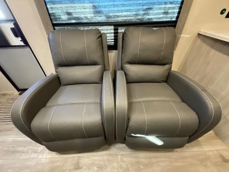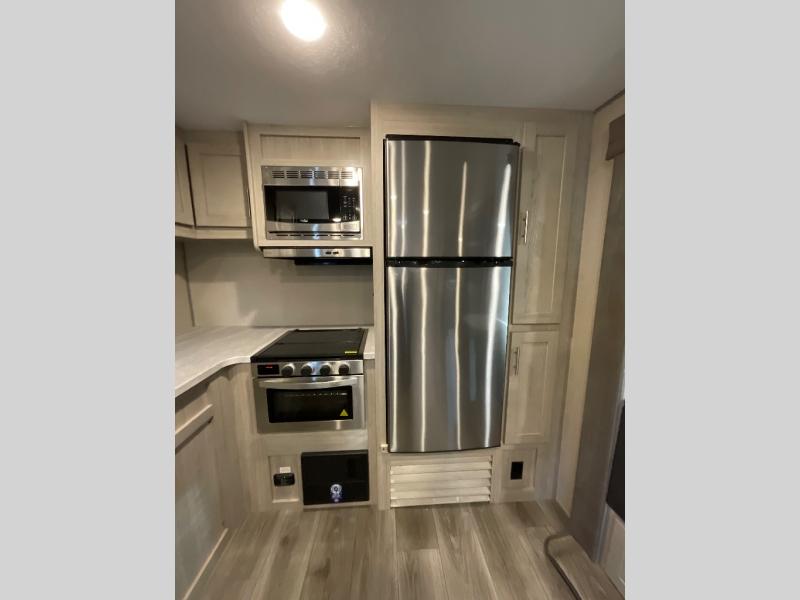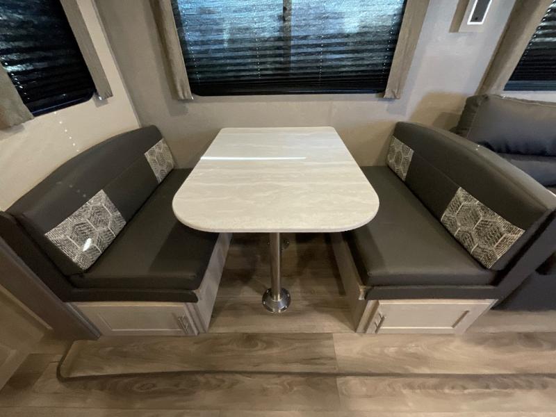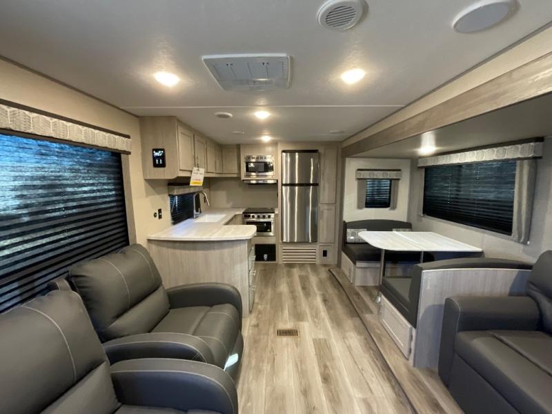 Whether you camp to relax indoors or play outdoors, this trailer offers interior comforts for a couple or a family of four! From the spacious rear kitchen thanks to the large slide out that includes a booth dinette and sofa. Yet you might like to choose the free standing dinette option in place of the booth dinette. The U-shaped counter offers plenty of space to dry dishes and prep meals. There is a 10 cu. ft. refrigerator and pantry for food storage, and everyone can enjoy the entertainment center with a fireplace option below while cooking, cleaning, dining and relaxing. And the recliner lounges will probably be popular seats. At night head to the front bedroom to sleep on the walk-around king bed after stopping off at the full bathroom to get cleaned up.