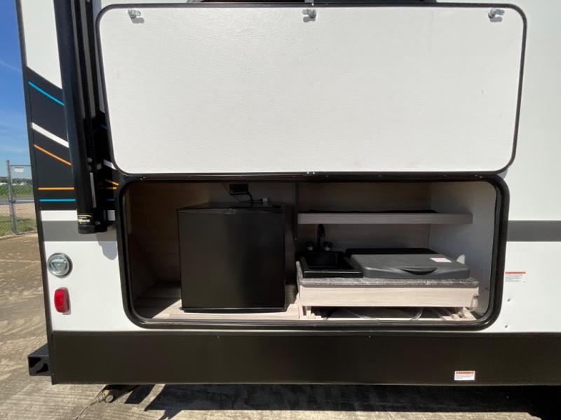 Some might say this is the "perfect size" trailer with double-size bunk beds, and a great place to entertain guests inside. You'll find a unique bar table with footrests, storage and four bar stools to dine at or enjoy a beverage while playing games. And outside you can whip up snacks using the exterior camp kitchen while your friends relax under the power awning, and your pet is secure to the trailer using the dog leash clip. Back inside you will sleep like royalty in the private bedroom and find plenty of storage plus a laundry center. There is a sofa with an end table to relax at, a 10 cu. ft. refrigerator for the cold items, a slide out for more floor space, plus a rear corner full bathroom to stay refreshed. And the lower bunk flips up to stow items away by using the Stor-More cargo door from the exterior to the interior. There are more convenient features such as the two kids convenience centers, the kitchen counter extension, and the exterior storage!