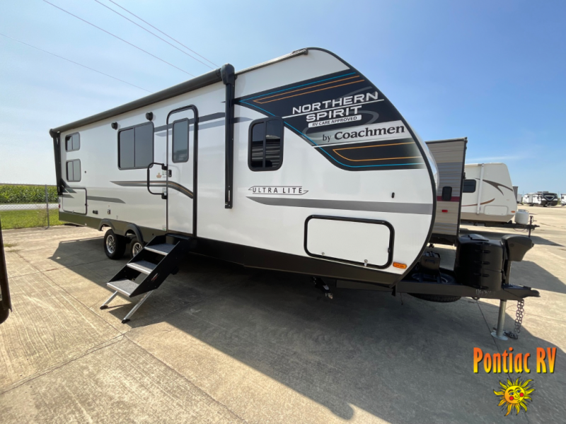 With any Northern Spirit Ultra Lite travel trailer by Coachmen, the "Twice Cool" dual ducted air conditioning system, the motion activated floor lights in the bedroom and bathroom, the lighted USB ports, the digital level, and the motion activated pass-through storage light plus fishing pole storage, will make your camping experience simplified. The heated and enclosed underbelly provides protection on the road and allows you to camp during any season, the 100W solar panel with 10 amp controller provides off-grid camping, and the power tongue jack makes setup easier. Each is built with a painted fiberglass front cap with LED strip lights, a laminated, aluminum framed floor, rear wall, and sidewalls, plus 5" trusses with interior vault. Make your decision today, and camp with everything in its place!