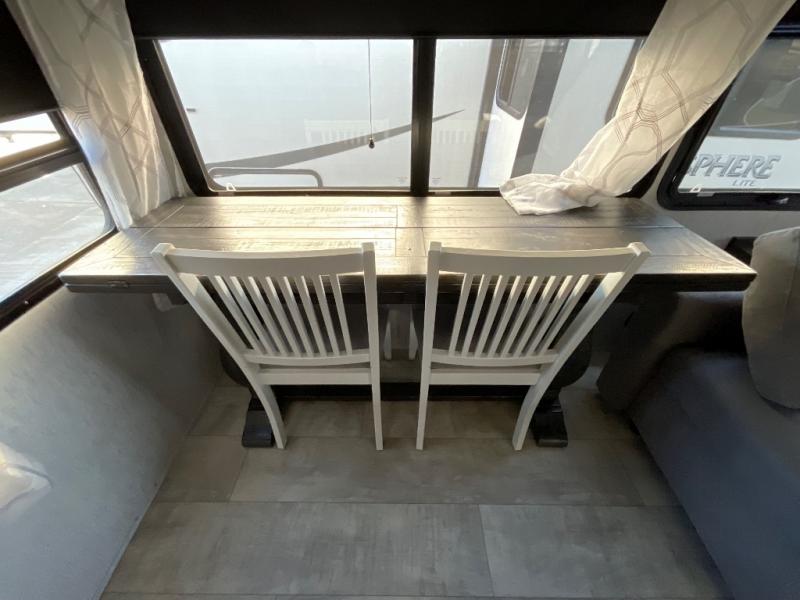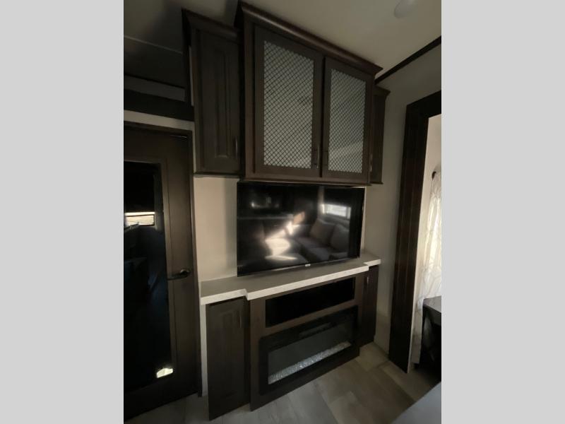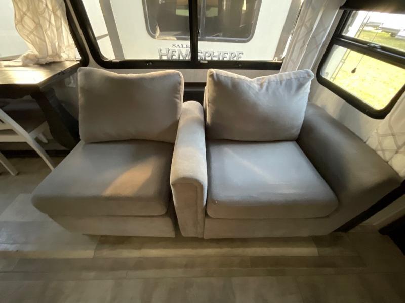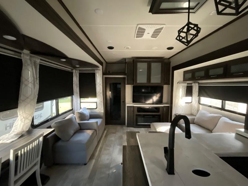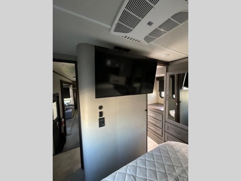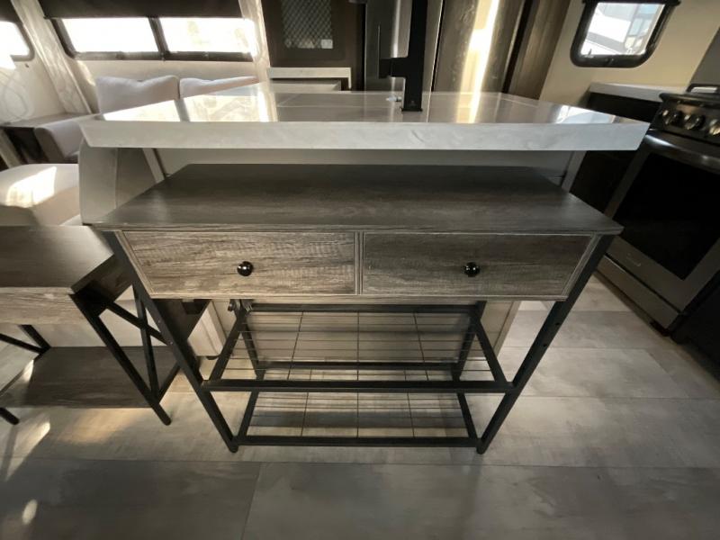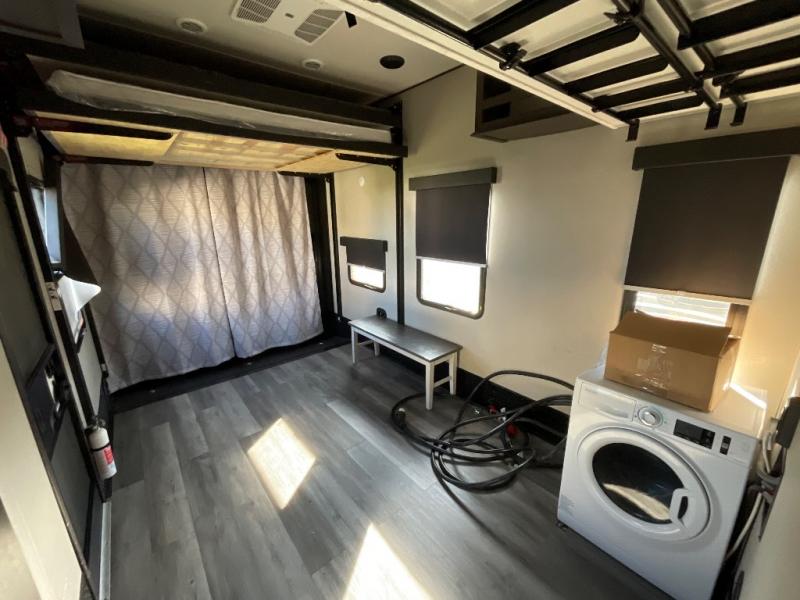 You want a toy hauler to carry your toys to the trails, and you can get an extra living room/bedroom out of this space once everything is unload when you add the Happi-Jac rollover sofas with a table with a top bed option. You might even like to add more optional features such a half bath and washer/dryer. There is an overhead loft bed and an L-shaped pull-out sofa in the main living area that offers sleeping space as well. Everyone can watch a movie on the LED TV with a fireplace below while sitting on the sofa, in the theatre seats, or while at the free standing dinette with four chairs. The chef will have upgraded appliances to make meals for everyone, an L-shaped countertop with a kitchen sink, and a USB charging outlet. You will love the sunken tub/shower with seat in the full bathroom with two space savings sliding doors that lead into the hallway, and into the front bedroom where you will have a walk-around queen bed, a slide out wardrobe and more USB charging outlets.