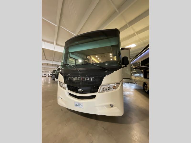 The Jayco Precept Class A gas motorhome comes with some features that you'll only find on a Jayco product, like the JRIDE PLUS which offers you a powerful blend of precise handling and renowned stability on the road and the JAYCOMMAND system powered by Firefly which allows you to control your coach's operations from just about anywhere with your phone. You'll find two-point lap seatbelts in all designated seating locations, and the one-piece, seamless fiberglass front and rear caps resist wear and tear over the years. The Precept also offers you the lightest yet strongest construction in the industry with the Stronghold VBL lamination on the roof, floor, and sidewalls. You'll also be very pleased to find a 120" panoramic windshield (the largest in the industry), automatic hydraulic leveling jacks, an Onan® Marquis Gold Genset 5,500W gas generator with auto-gen start, and a Girard® tankless LP water heater.