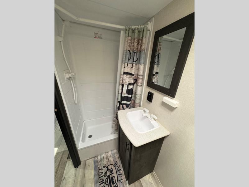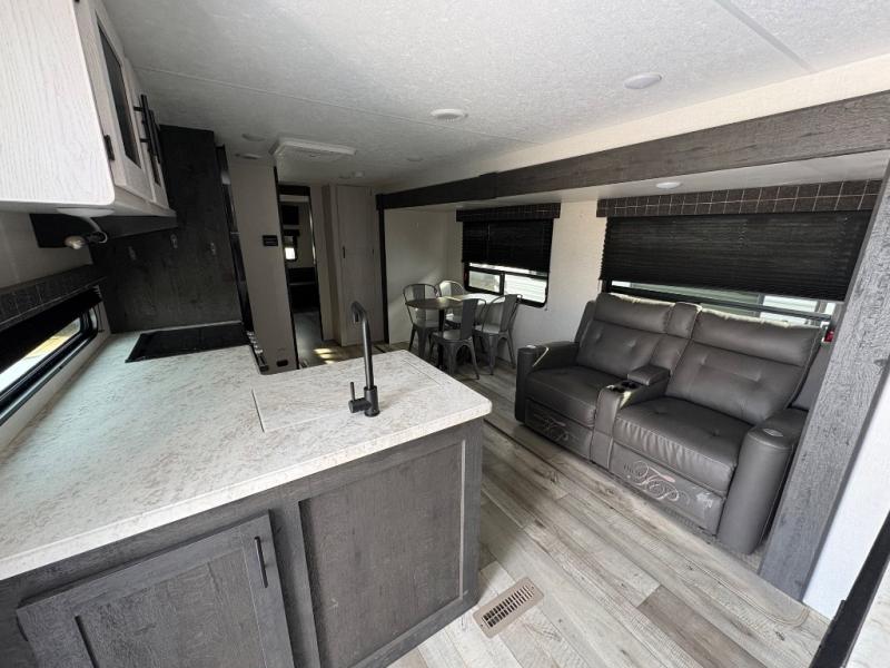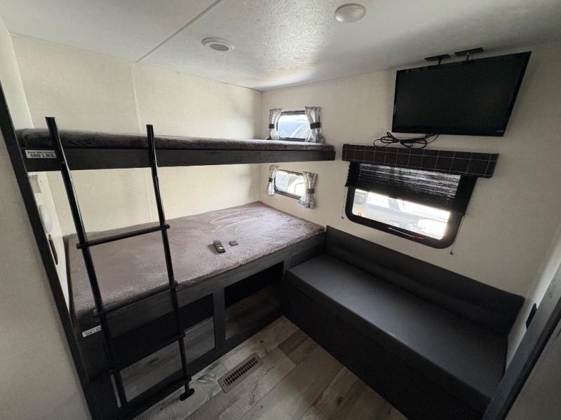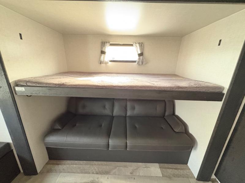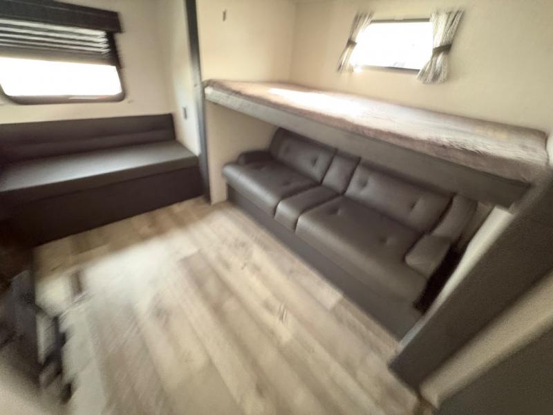 If you've been looking for a travel trailer with plenty of space for your family or group of friends, look no further than this one! The private bunkhouse includes two bunks, plus a third bunk across the room and a jiffy sofa below. There is also a bench seat here, and the full bath is close by for convenience. Everyone can gather in the main living area at the 80" U-shaped dinette, and there is a 64" sofa here for more seating space. If the weather is nice, head outdoors to relax under the 20' power awning with LED lights as the cook prepares dinner on the outside griddle!