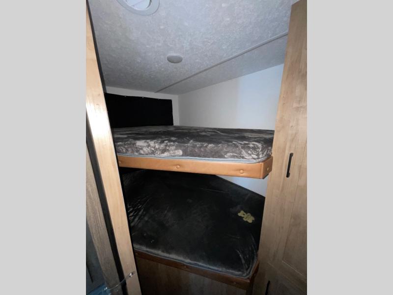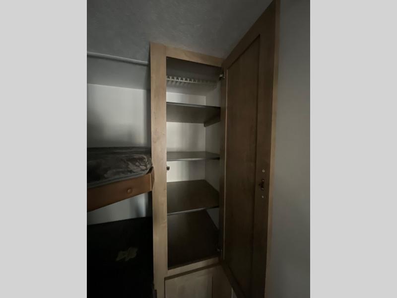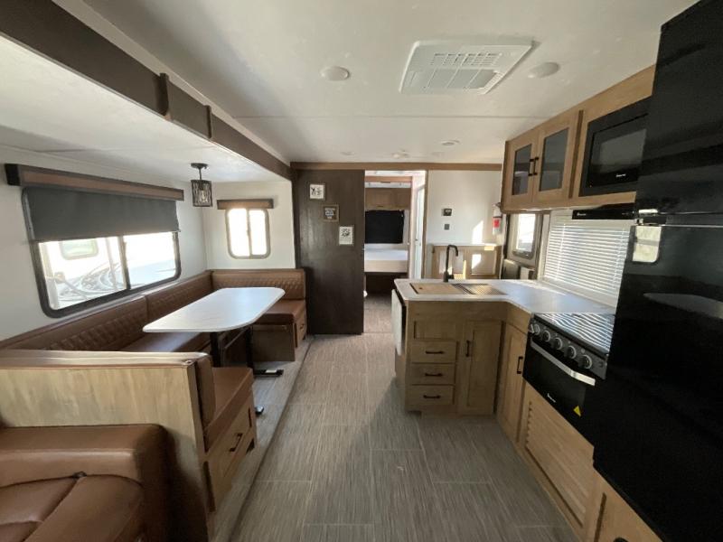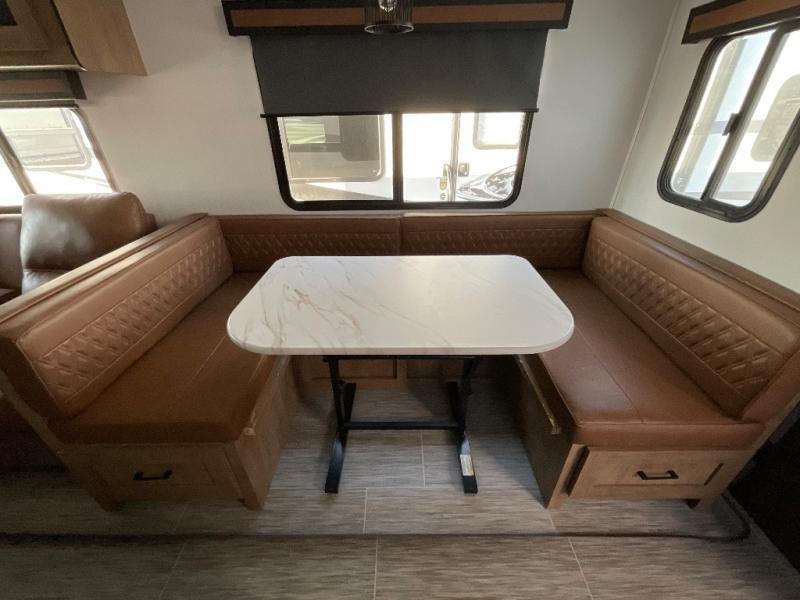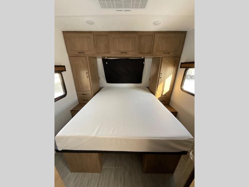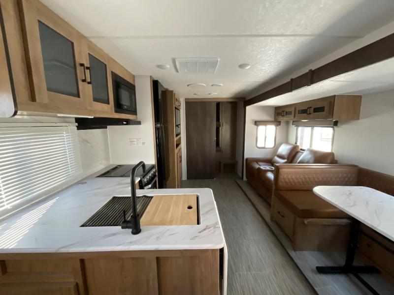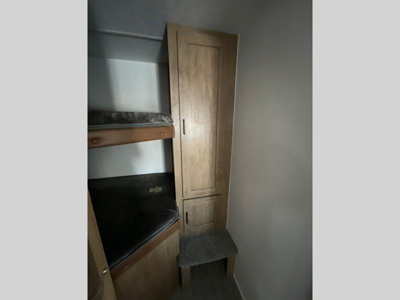 You can't go wrong with this spacious travel trailer in tow! When you arrive at the campground, prepare a quick lunch on the pull-out camp kitchen and set up the 20' power awning with LED lights. You can grab the fishing poles from the pass-through storage and head down to the lake. The walk-through bath will allow you to freshen up before dinner, and you may even want to start a game of cards at the U-shaped dinette. This model includes a simple private bunkhouse with double-size bunks, a wardrobe, and a step leading up to the top bunk, and the front master bedroom will be perfect for you and your spouse. Here, you'll find a queen bed with vaulted under-bed storage and dual wardrobes for your tablet and phone.