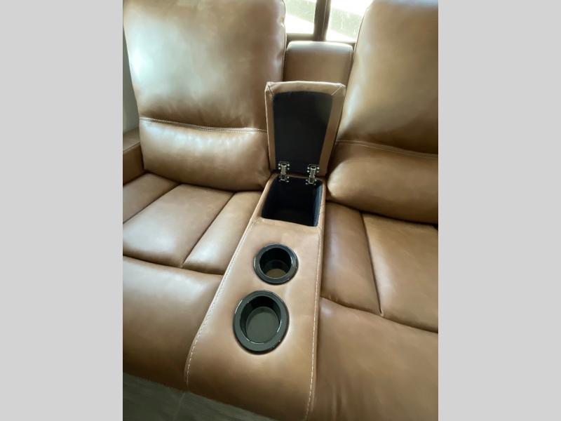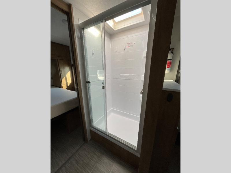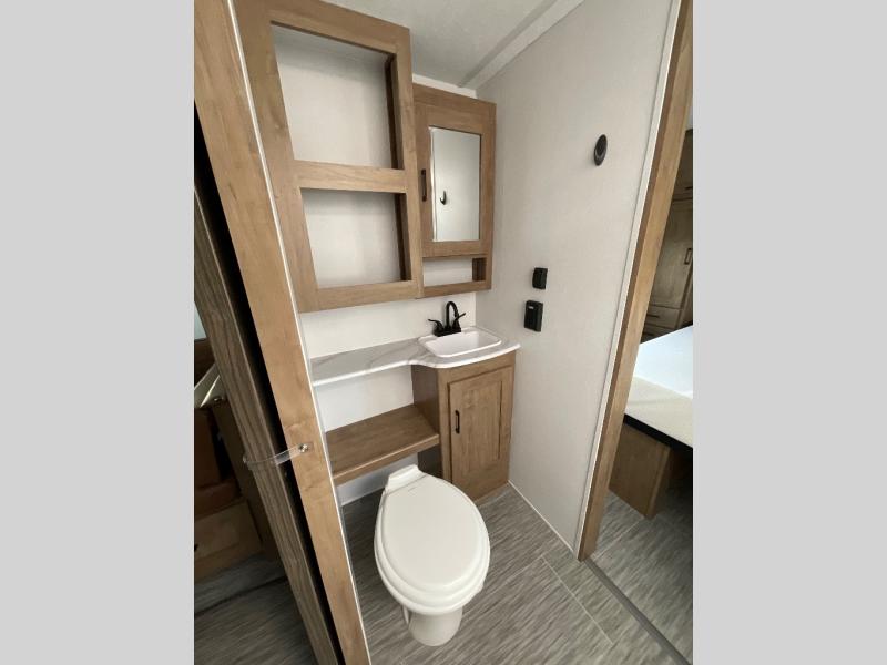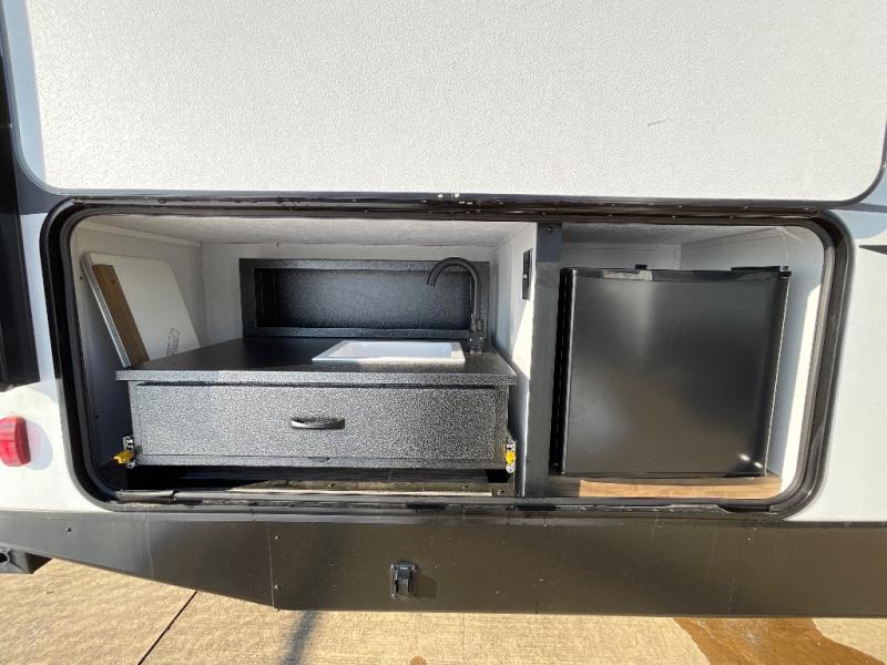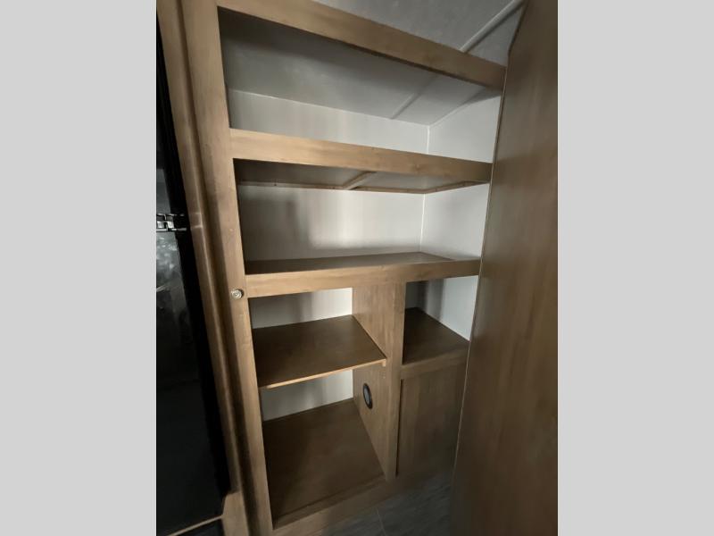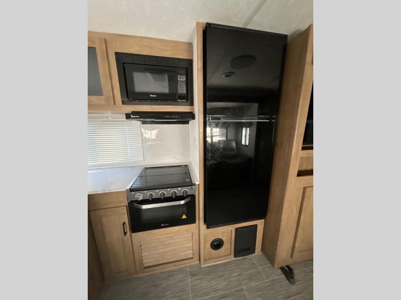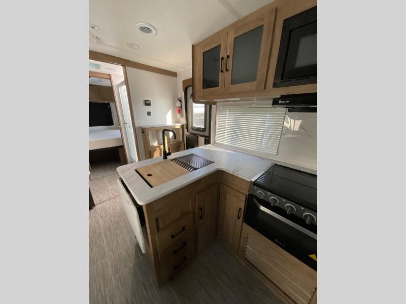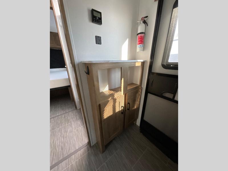 You can't go wrong with this spacious travel trailer in tow! When you arrive at the campground, prepare a quick lunch on the pull-out camp kitchen and set up the 20' power awning with LED lights. You can grab the fishing poles from the pass-through storage and head down to the lake. The walk-through bath will allow you to freshen up before dinner, and you may even want to start a game of cards at the U-shaped dinette. This model includes a simple private bunkhouse with double-size bunks, a wardrobe, and a step leading up to the top bunk, and the front master bedroom will be perfect for you and your spouse. Here, you'll find a queen bed with vaulted under-bed storage and dual wardrobes for your tablet and phone.