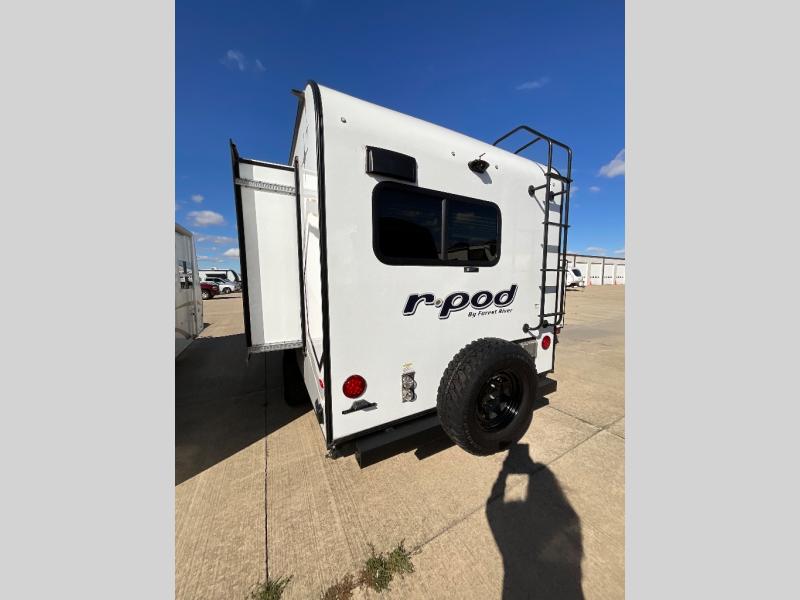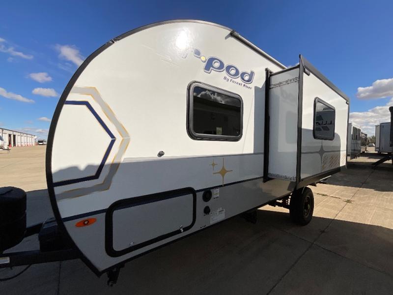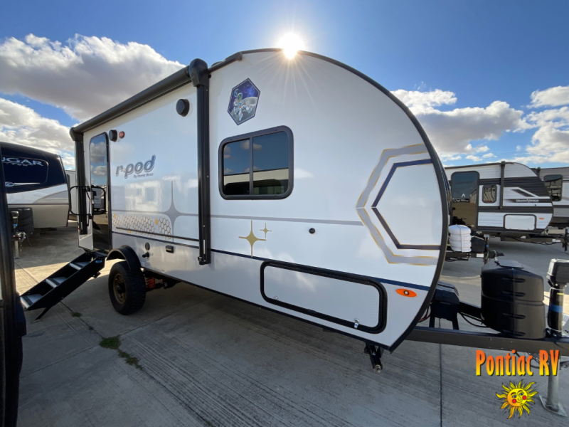 With any R Pod travel trailer by Forest River, you will find affordable luxury and lightweight towing! The Azdel sidewall construction and aluminum framing provide a durable RV made to last, and you'll love the new premium exterior graphics! There is also a tire pressure monitoring system outside, along with a friction hinge entrance door, a power tongue jack, and an exclusive aluminum wheel upgrade. Head inside to enjoy butcher block countertops, multipurpose vinyl furniture, a Showermiser water system, and new Cosmic Graphite decor. The large solar panel will provide off-gird capabilities, plus there is a 2,000W inverter and 30A charge controller for added convenience!