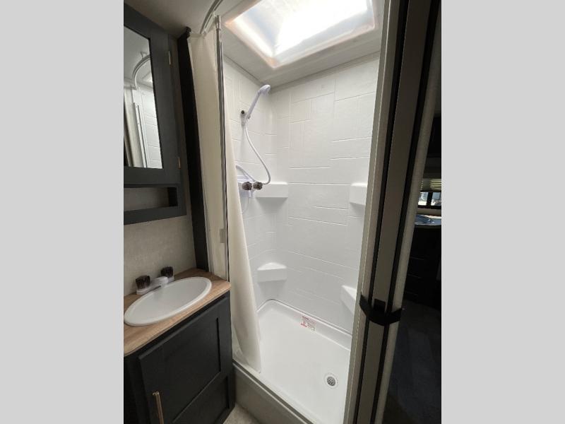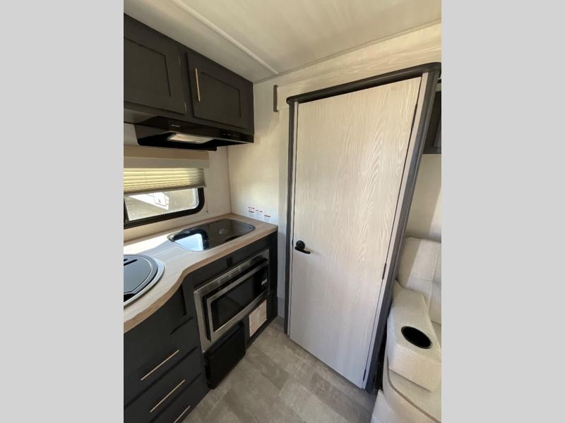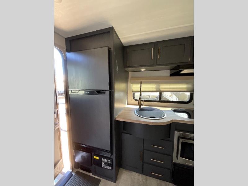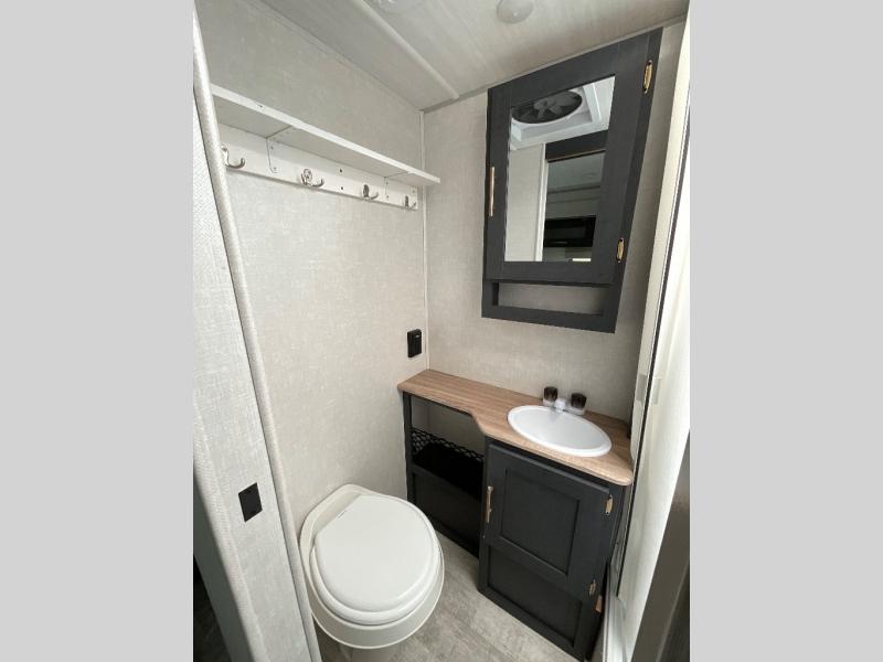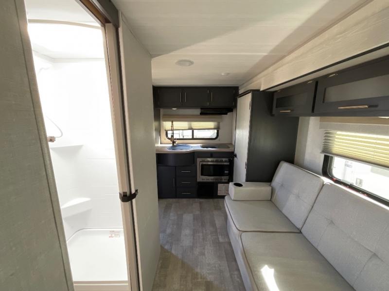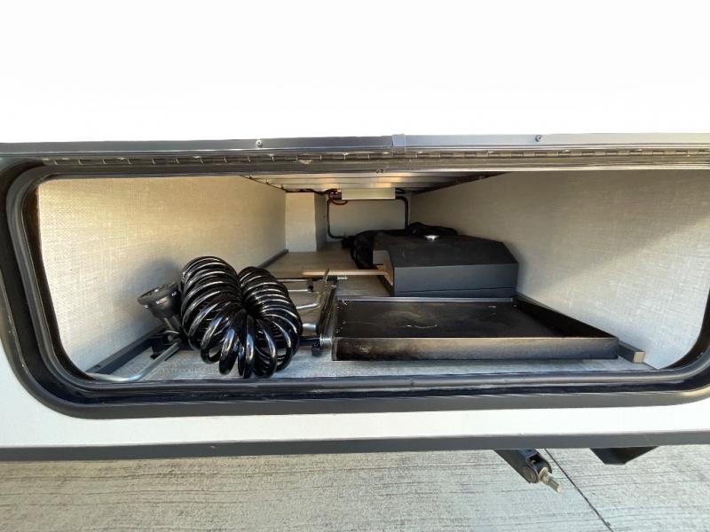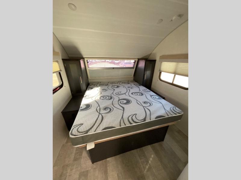This is the perfect travel trailer for a couple or a smaller family, so pack your bags and get ready for an adventure in this R-Pod! After you've set up camp and had a look around the campgrounds, you can prepare lunch on the two-burner cooktop and in the convection microwave found in the rear kitchen. There is a convenient largest-in-class refrigerator and pantry to store your favorite snacks and perishables, plus overhead compartments for more items. The full bath allows you to skip the camp's facilities, and the exterior storage provides space for you to bring along the fishing poles!