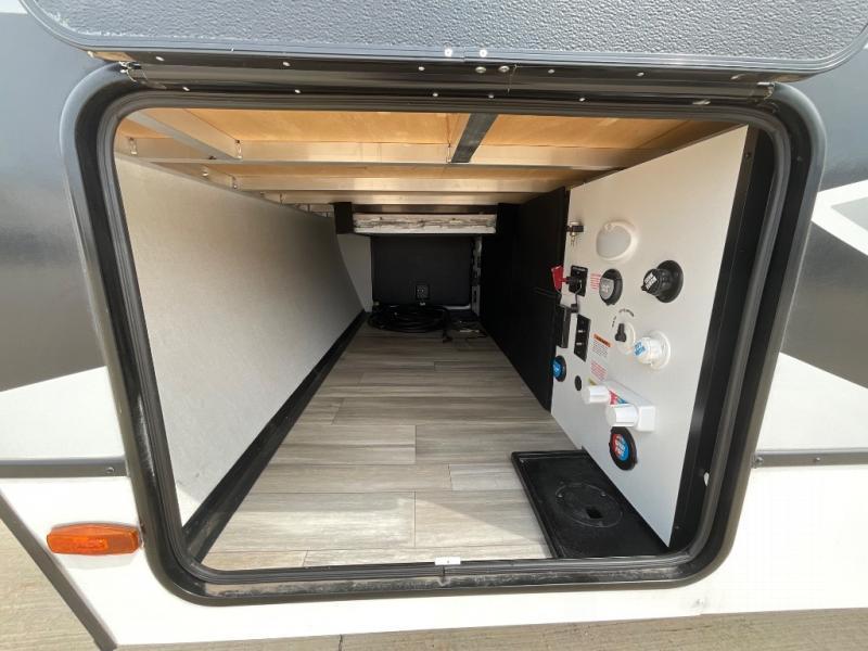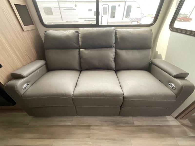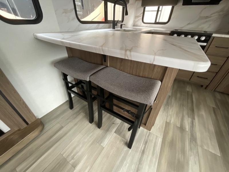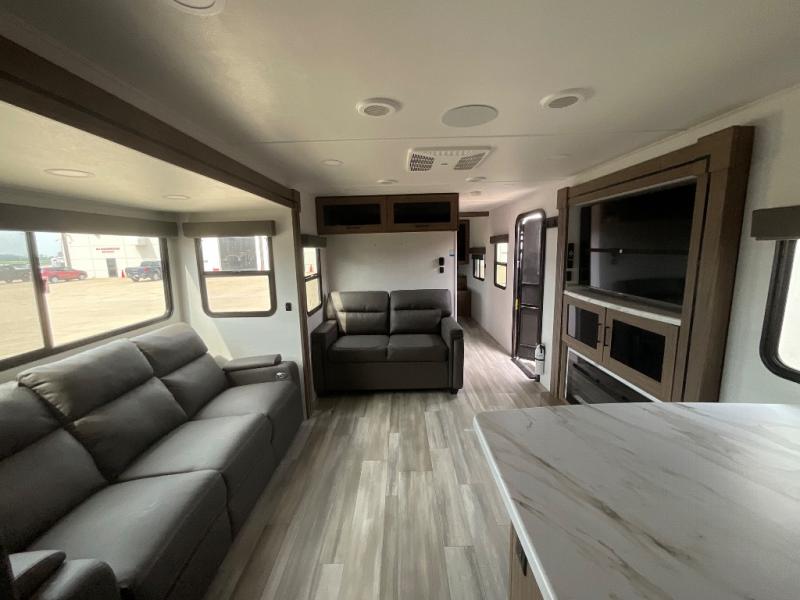 Start camping in luxury with this travel trailer! Prepare your best home cooked meals in the rear kitchen with the three burner cooktop, 10 cu. ft. 12V refrigerator, tip-out trash can, and even two bar stools to enjoy your morning coffee while reading the newspaper. Freshen up in the full bathroom with the 30" x 36" shower or head outside to relax under one of the two awnings. There is even an outdoor griddle/grill underneath one of the awnings to protect you while you grill up some juicy burgers, plus an outside 32" TV. The front private bedroom has a queen bed for you to lay your head on at night and has wardrobe nightstands for your items. Relax in true comfort each night on one of the two furniture spots in front of the entertainment center with a 50" class HDTV with a fireplace below it!