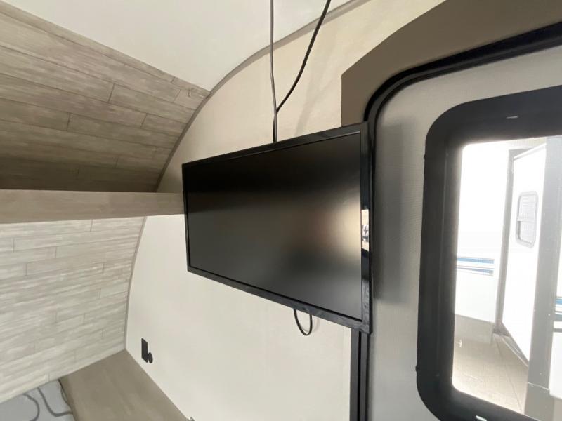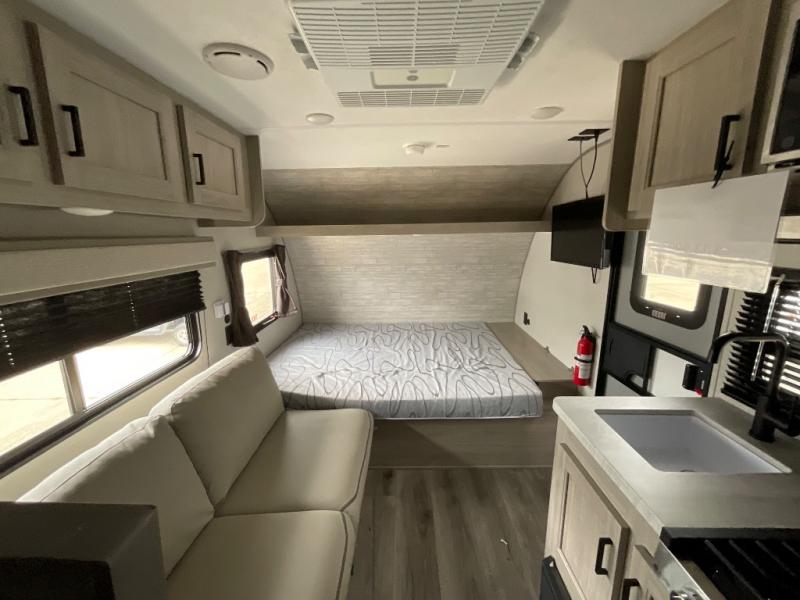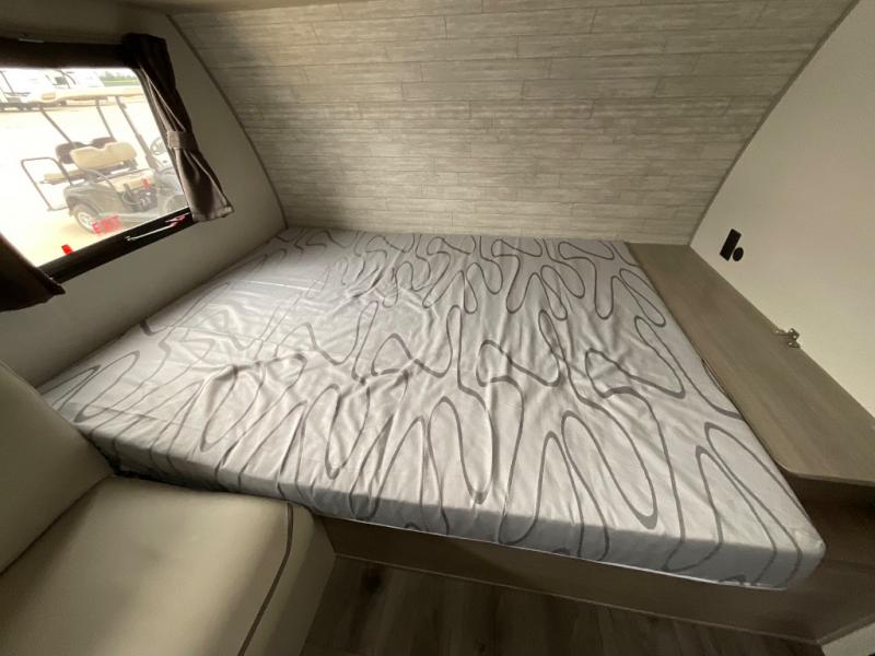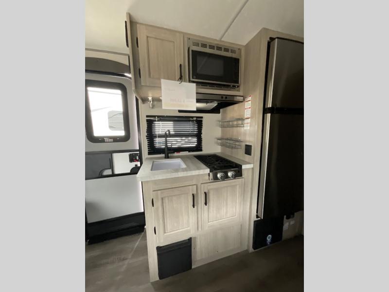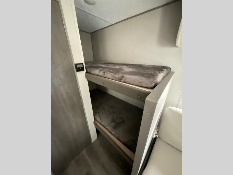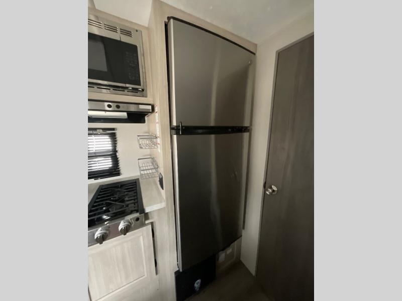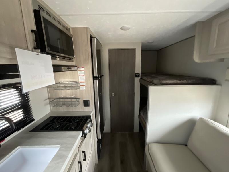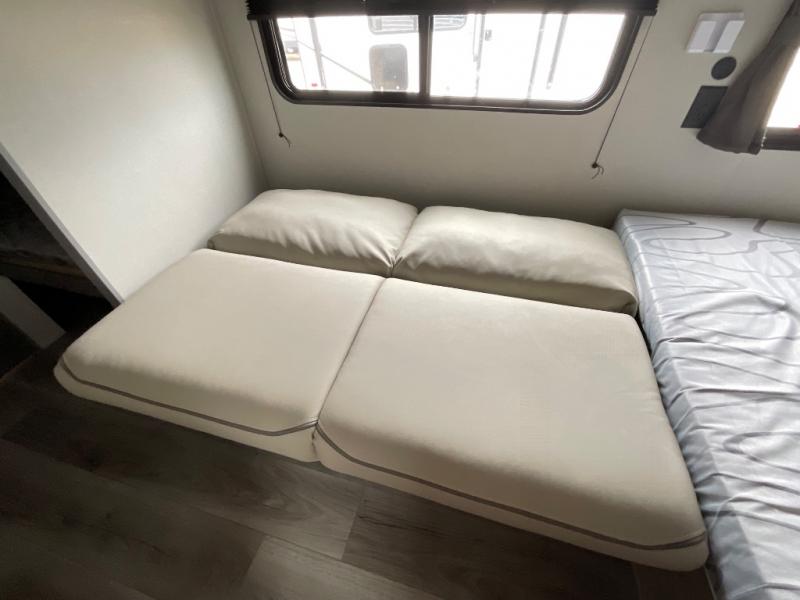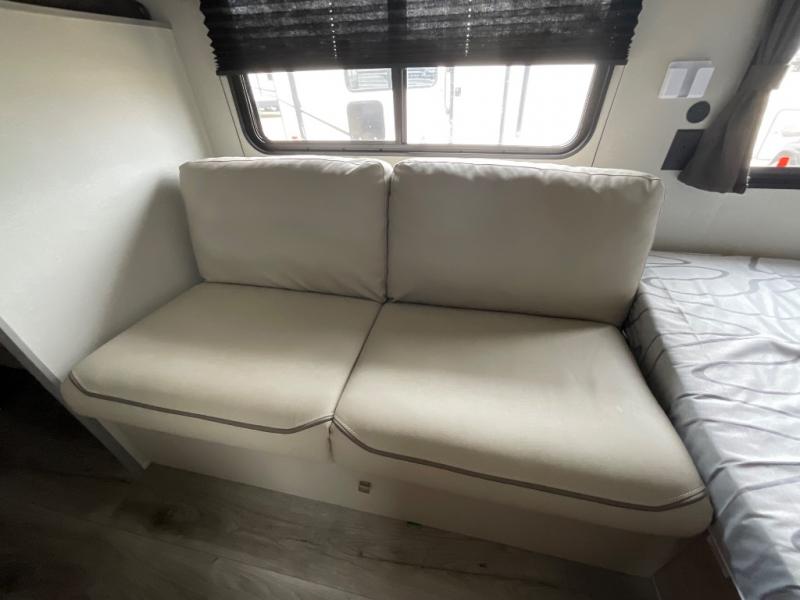 This travel trailers is perfect for a young family or smaller group. You can easily sleep four or more with the rear set of bunk beds and queen bed up front. There is also a 60" sofa for inside down-time, as well as complete kitchen and bath amenities so you can cook and stay clean while traveling. The rear corner bath features a toilet and 36" x 30" shower, and it's conveniently located next to the bunk beds which is great for little ones at night. Cooking inside will be easy with a GE stainless two-burner cooktop and single sink, plus there is also a GE microwave oven for snacks and things that you can easily warm up. If you plan to spend most of your time outdoors, you will find plenty of storage space in the front exterior storage compartment, and there is also plenty of storage inside as well.