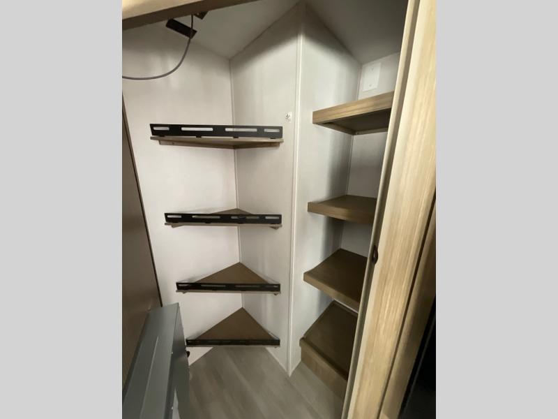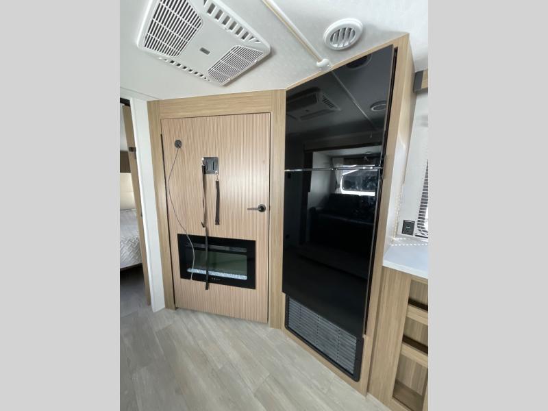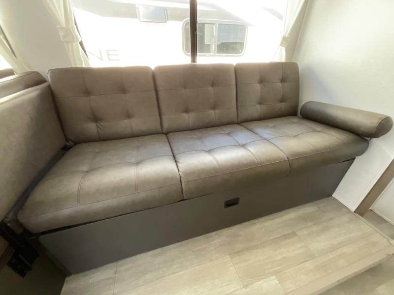 You're sure to make camping memories in this spacious travel trailer! You can easily sleep eight people each night thanks to the double-size bunks, the custom king bed with Versa Tilt in the front bedroom plus the Versa-Lounge within the large slide out! The full kitchen will let you make meals each day, and you'll appreciate the hidden pantry with shelves behind the fireplace. There is also a booth dinette where you can dine together or play a game of cards after dinner is cleaned up, or you may just find yourselves outdoors under the 16' awning. And don't overlook the full bath, complete with a tub/shower that will make bath time easier if you have little ones.