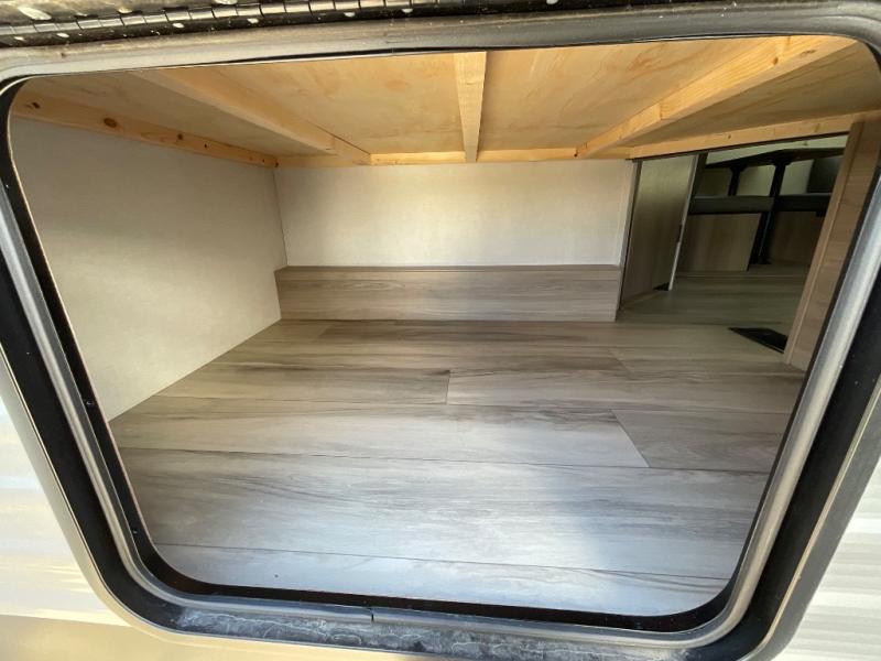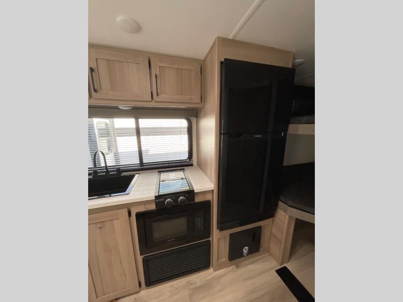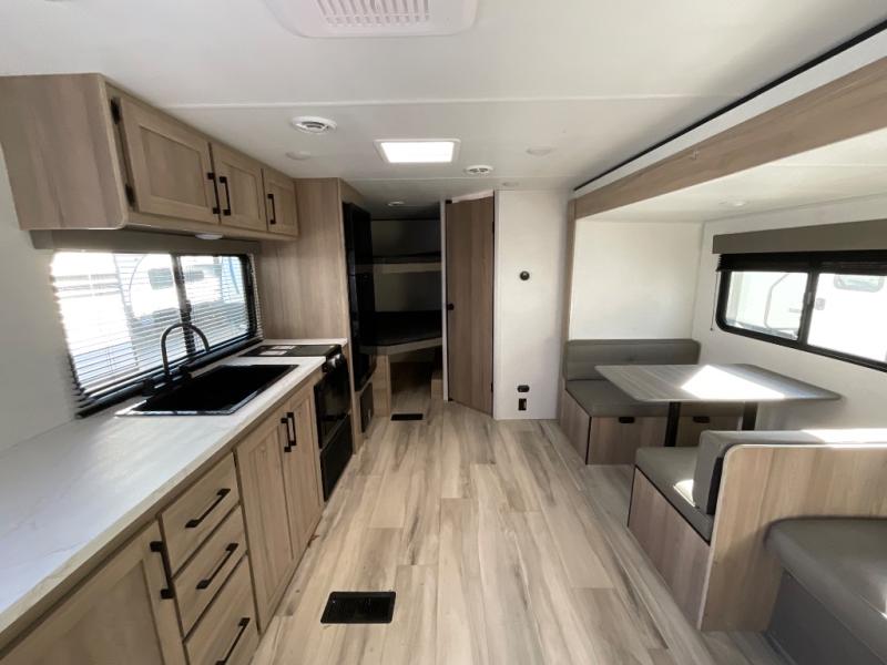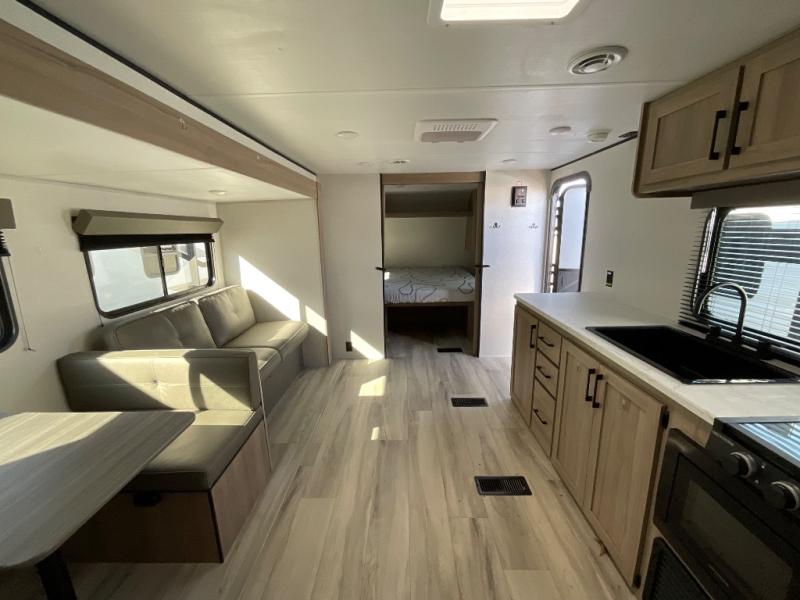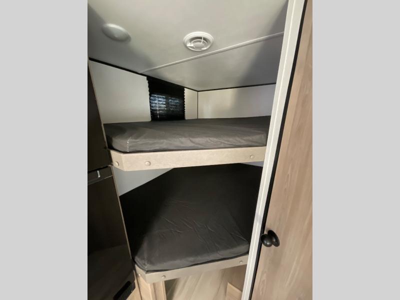 The whole gang will love camping in this bunkhouse model with a super slide! While your guests take the bunks, you can have the queen bed in the front bedroom all to yourselves. A sofa and booth dinette within the slide provide seating space and additional sleeping space, and the full kitchen includes a two burner cooktop and microwave oven to cook meals. Head outdoors to enjoy the 16' power awning, or grab your fishing poles from the pass-through storage and head down to the lake.